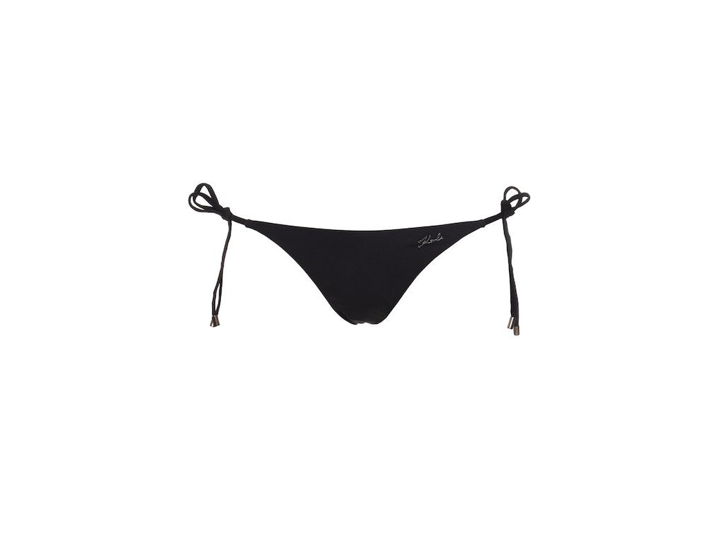 Dámské dvoudílné plavky Karl a Choupette Karl Lagerfeld v černé barvě, zdobené lesklou aplikací Karla a kočičky. Podprsenka má vyjímatelné vycpávky. Kalhotky zavážete na bocích na tkaničky - na hlavním fotu jsou kalhotky bez tkaniček. Kalhotky jsou zdobené kovovým černým logem.