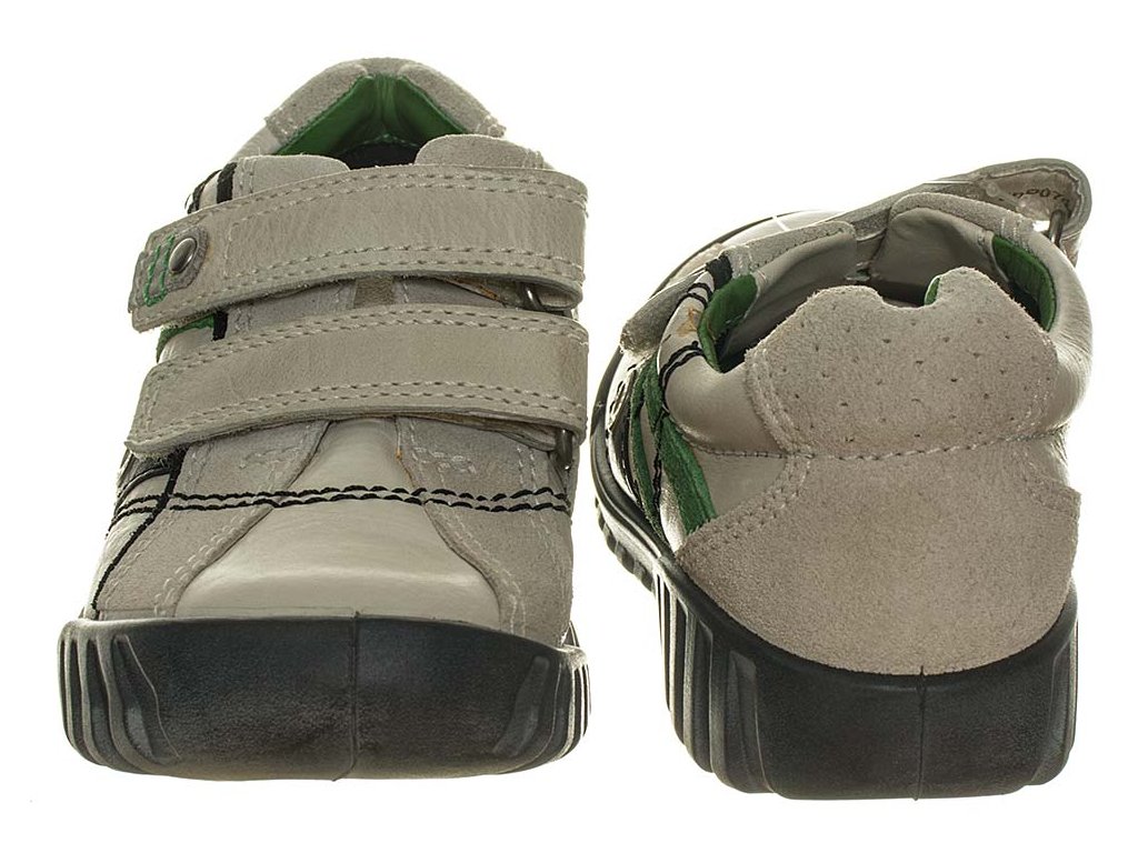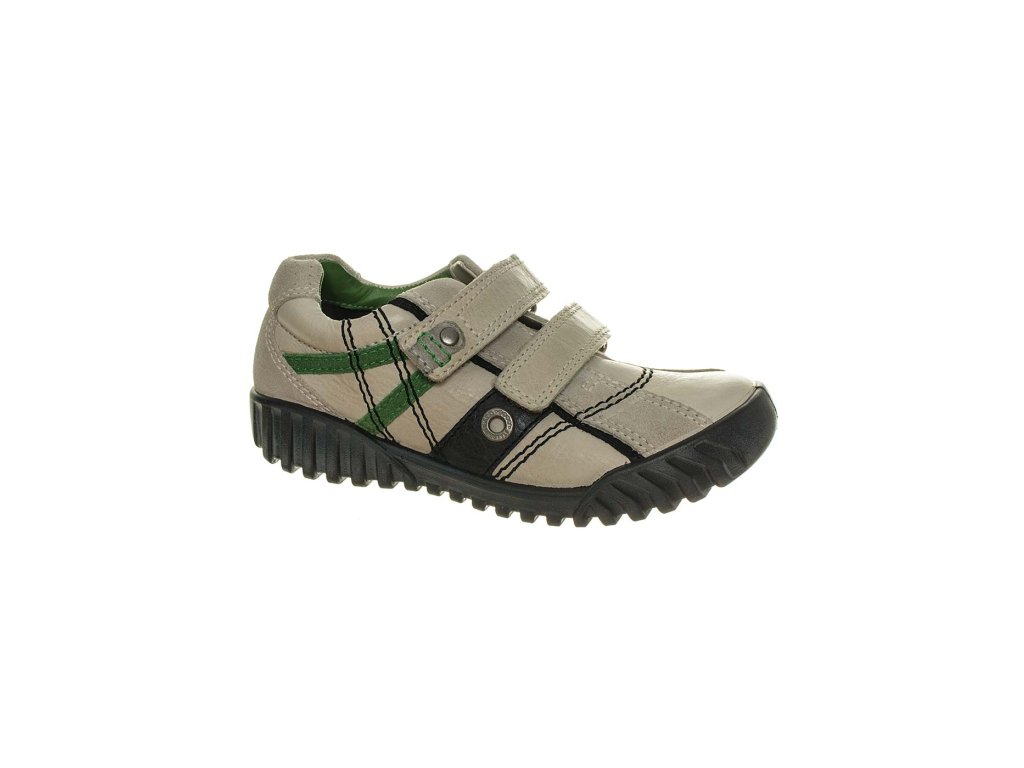 Dětské boty značky ECCO. Tenisky na suchý zip celokožené v béžové doplněná prvky černé a zelené barvy. Na jazyku logo "ECCO". Odolné, pevné s polstrovanou stélkou. Patent prodyšné podrážky - noha dýchá, nepotí se