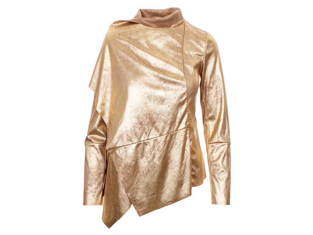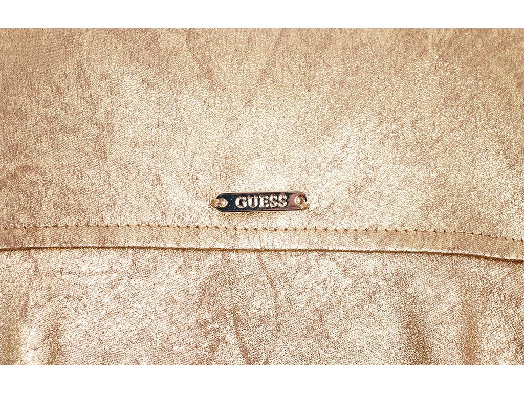 Dámské sako Guess ve zlaté barvě. Velmi příjemný nepodšitý materiál, zajímavě střihově řešené, na zádech kovová placka s logem. Užijete i při slavnostních příležitostech, na párty, na oslavách , ale i ve volném čase.