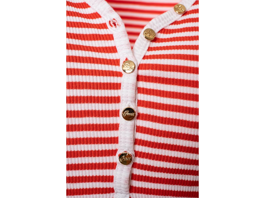Dámské tílko Guess v trendy pruhovaném vzhledu zdobené funkčními knoflíky s nápisem Guess.