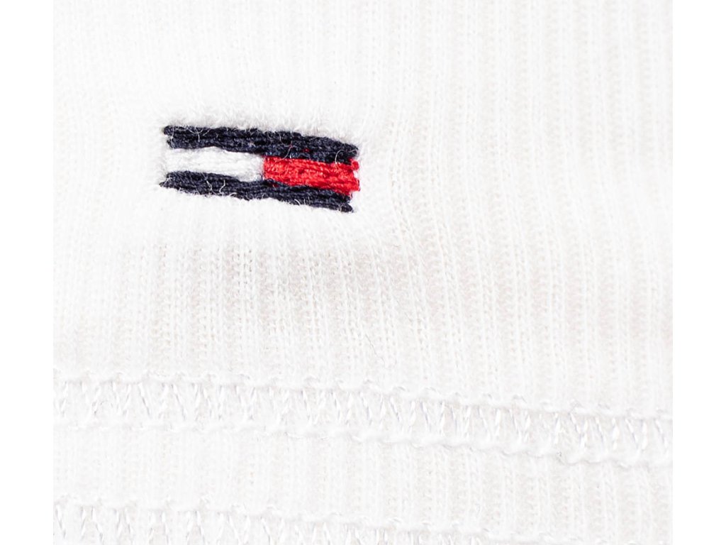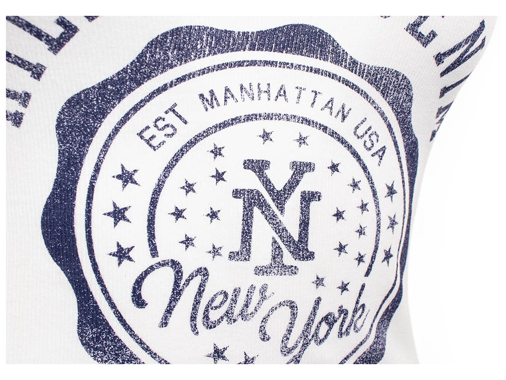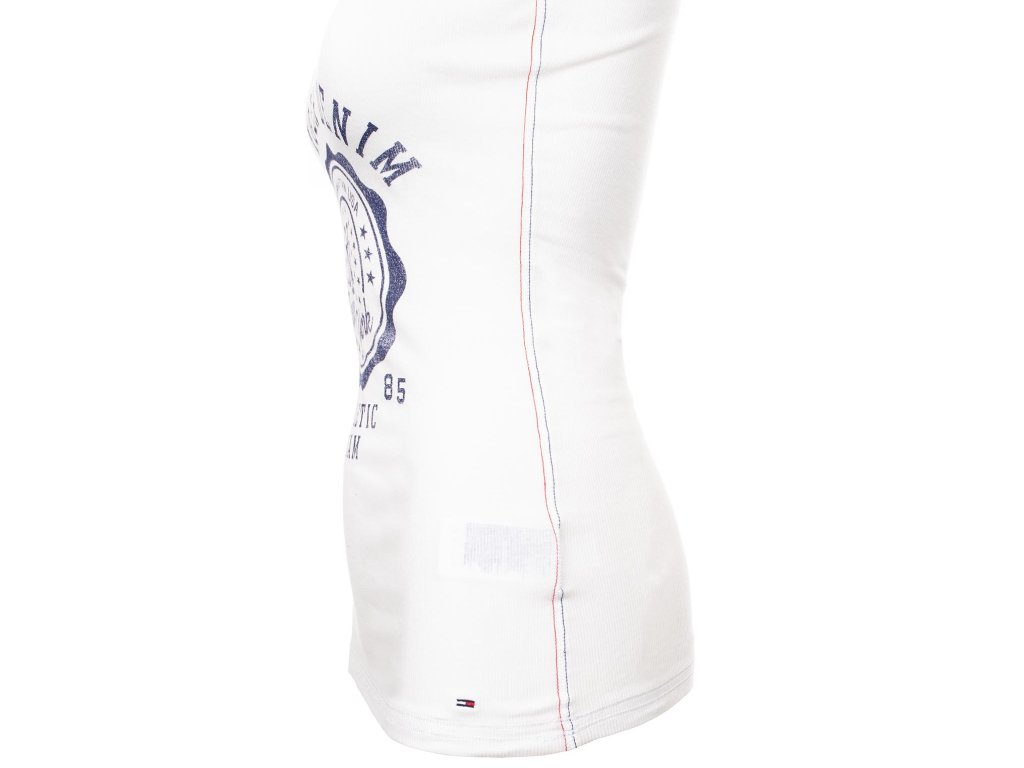 Dámské žebrované tílko Hilfiger Denim ve sněhově bílé barvě s tmavě modrým potiskem na prsou, v dolním kraji vyšitá vlaječka TH. Na bocích ozdobně prošívané v barvách TH.