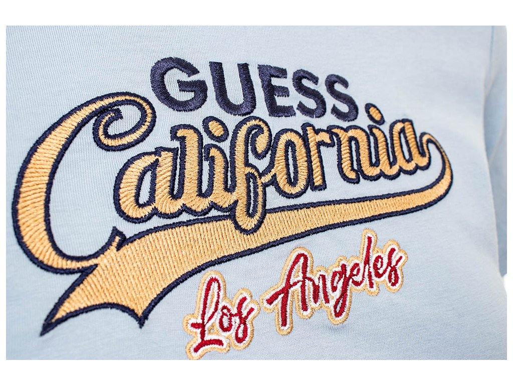 Dámské bavlněné tričko Guess v bledě modré barvě. S béžovou aplikací nápisu a vínovým vyšitým logem.