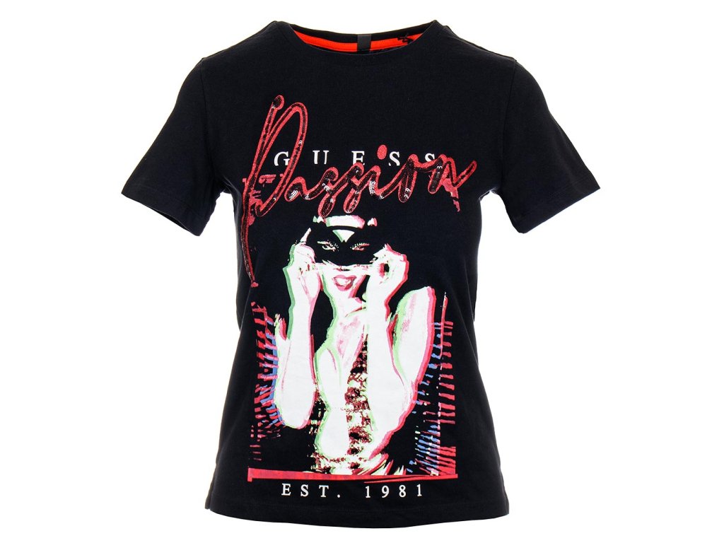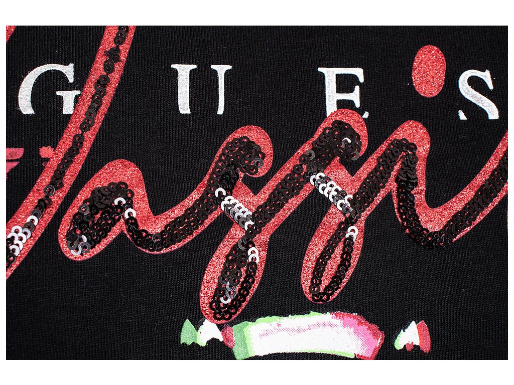 Dámské tričko Guess v černé barvě. Na prsou zdobené potiskem s třpytkami a flitry. Velmi příjemný materiál, boky jsou zakončeny rozparky.