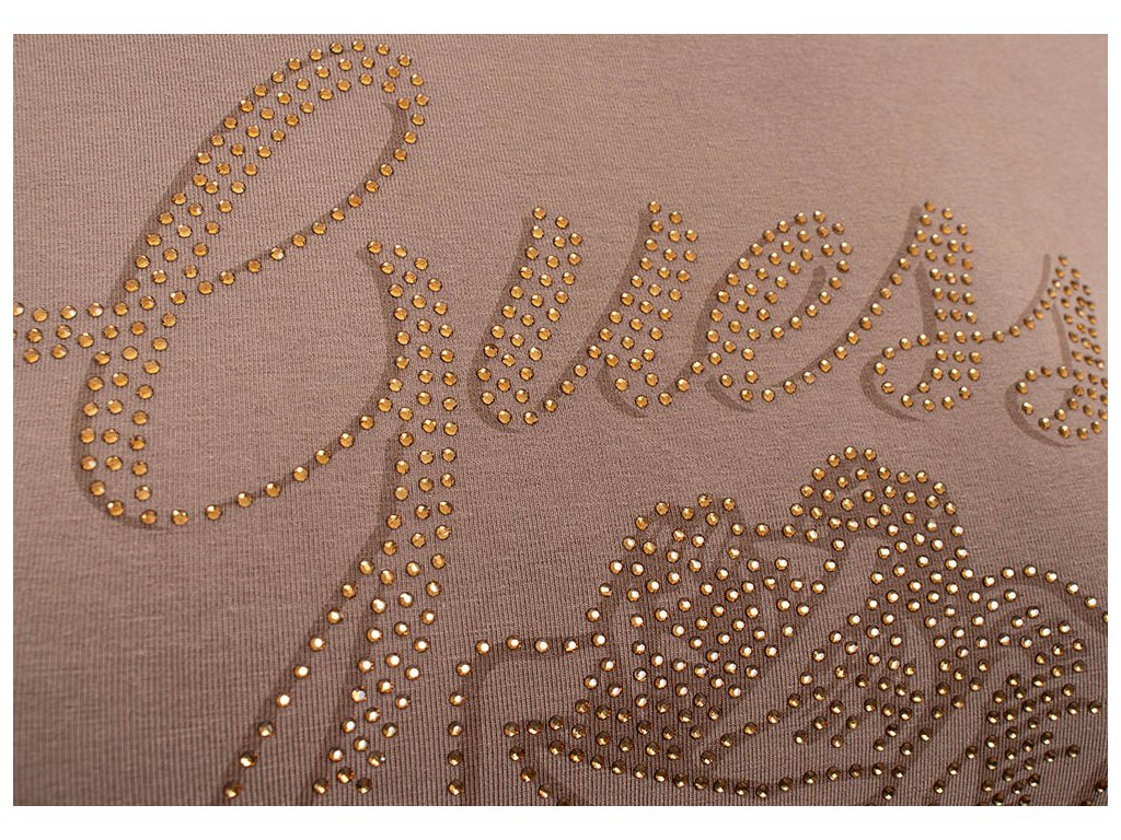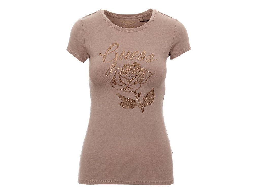 Dámské tričko Guess v hnědé barvě na prsou zdobené třpytivými kamínky. Příjemný pružný materiál.