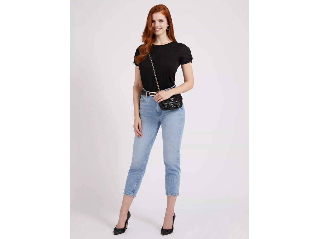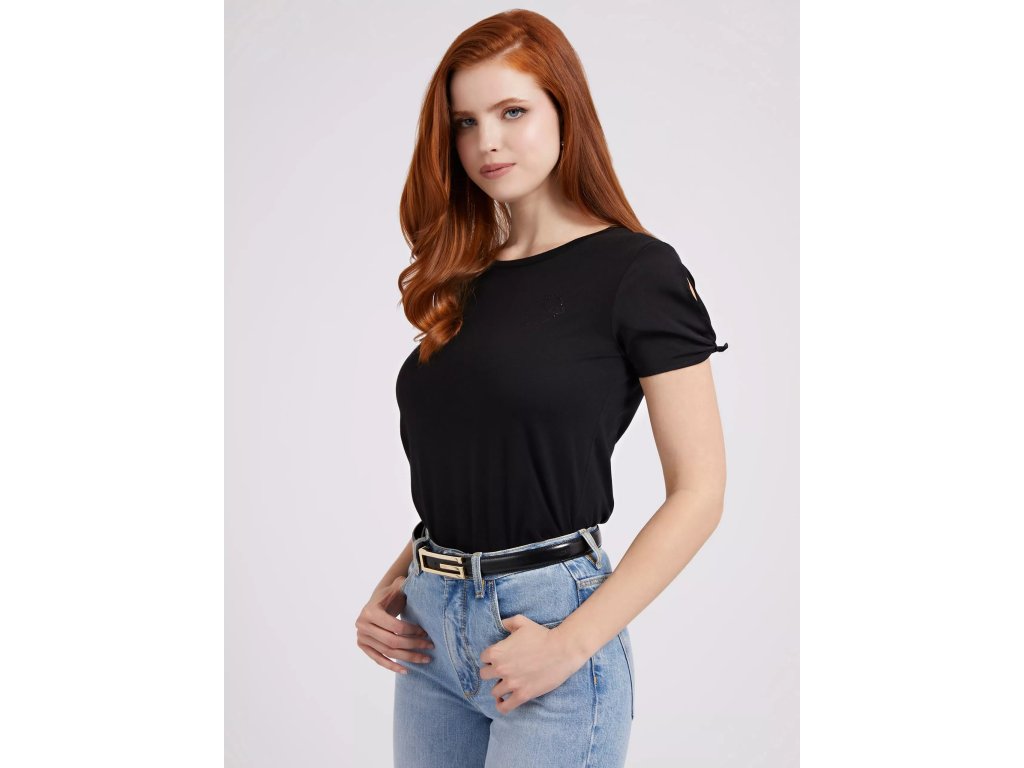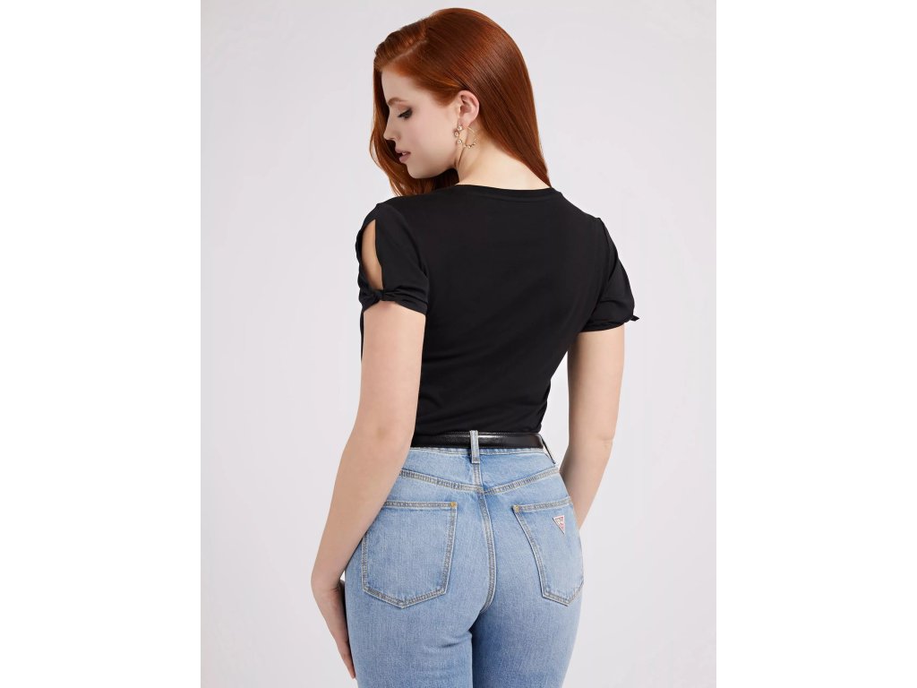Elegantní černé tričko Guess se zajímavě řešenými rukávky. Na prsou decentní logo Guess zdobené černými lesklými kamínky. Toto tričko využijete při každodenním nošení , ale také třeba na party nebo večeři.