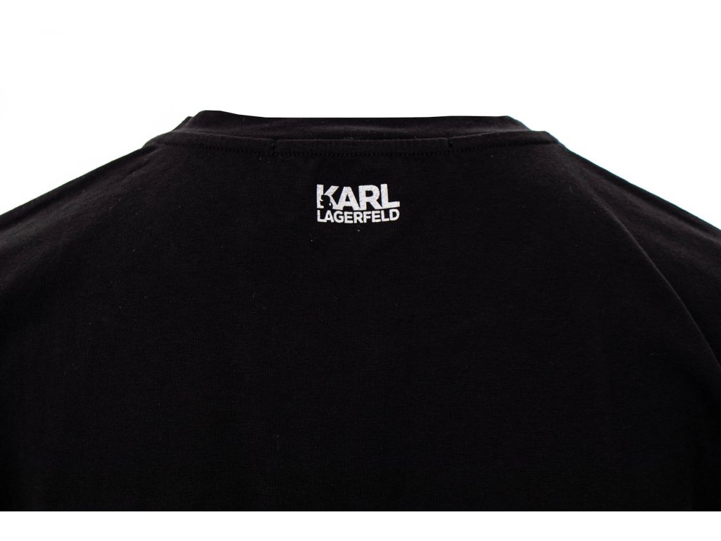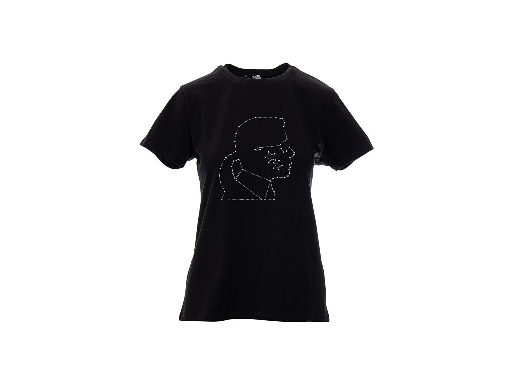 Příjemné bavlněné pružné triko v černé barvě od Karla Lagerfelda. Triko zdobí stříbrný potisk profilu Karla Lagerfelda, doplněný třpytivými drobnými kamínky. Na krku vzadu je triko ještě doplněné o drobný stříbrný potisk loga "Karl Lagerfeld".