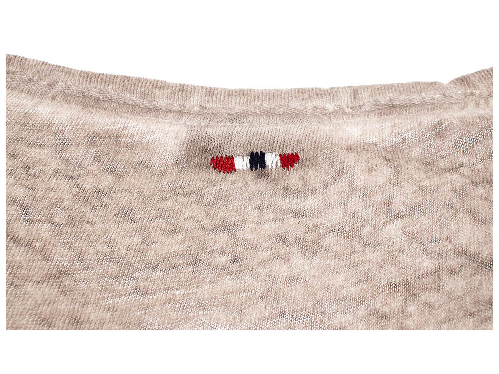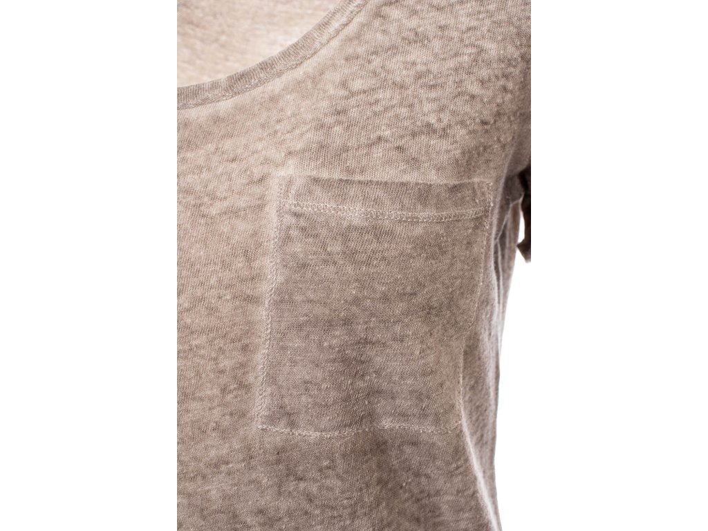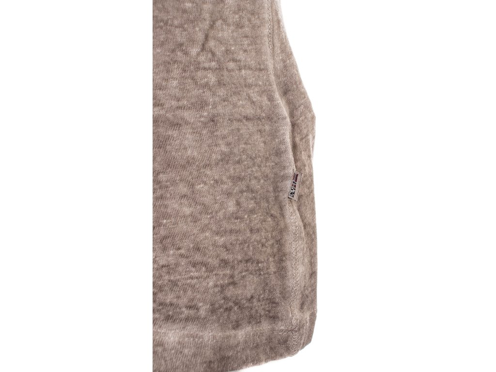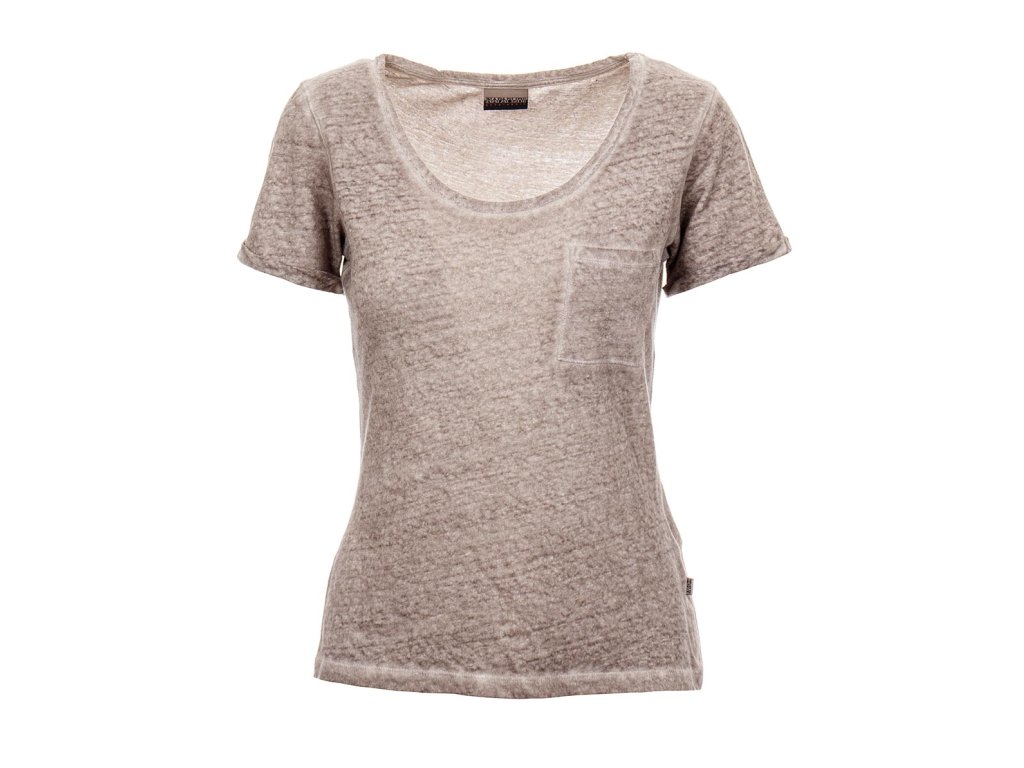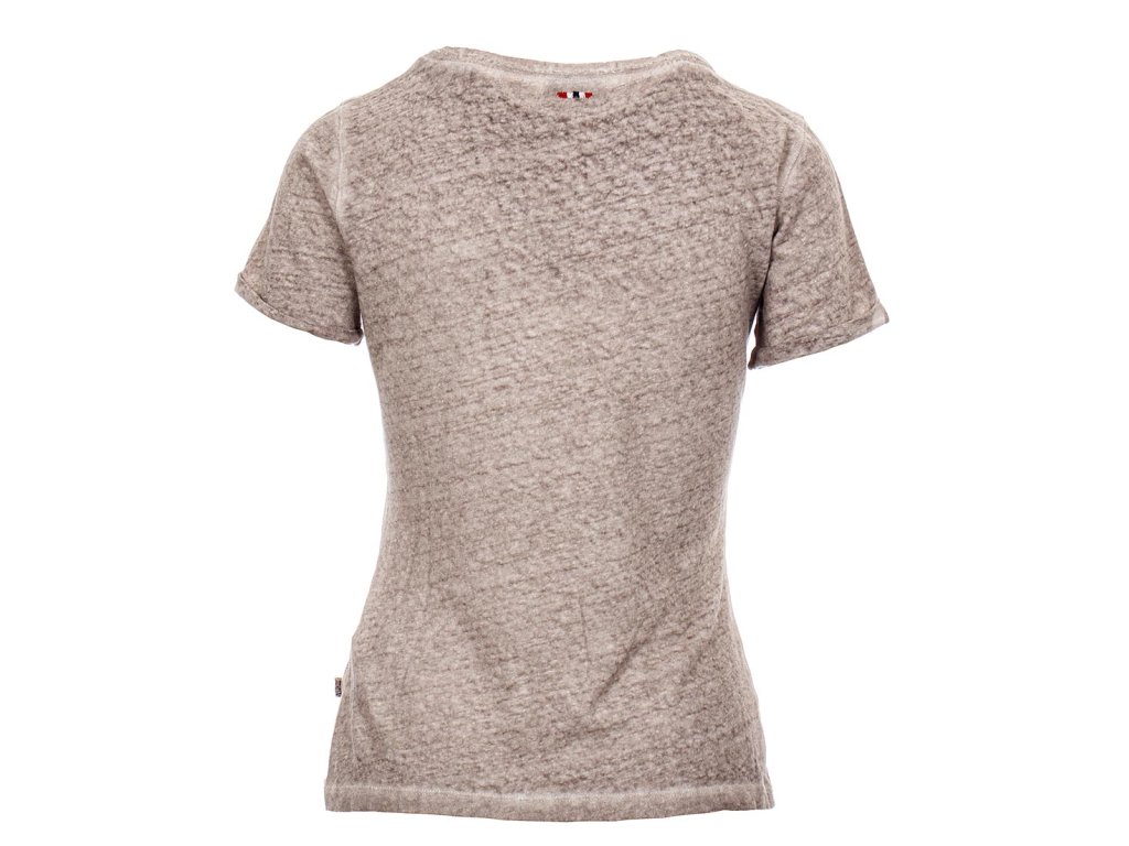 Dámské tričko Napapijri v krásné tmavší béžové žíhané barvě. Kulatý větší výstřih, kapsička na prsou, v boku všitá vlajka Napapijri, za krkem vyšitý znak značky, rukáv v dolním kraji ozdobně ohrnutý.