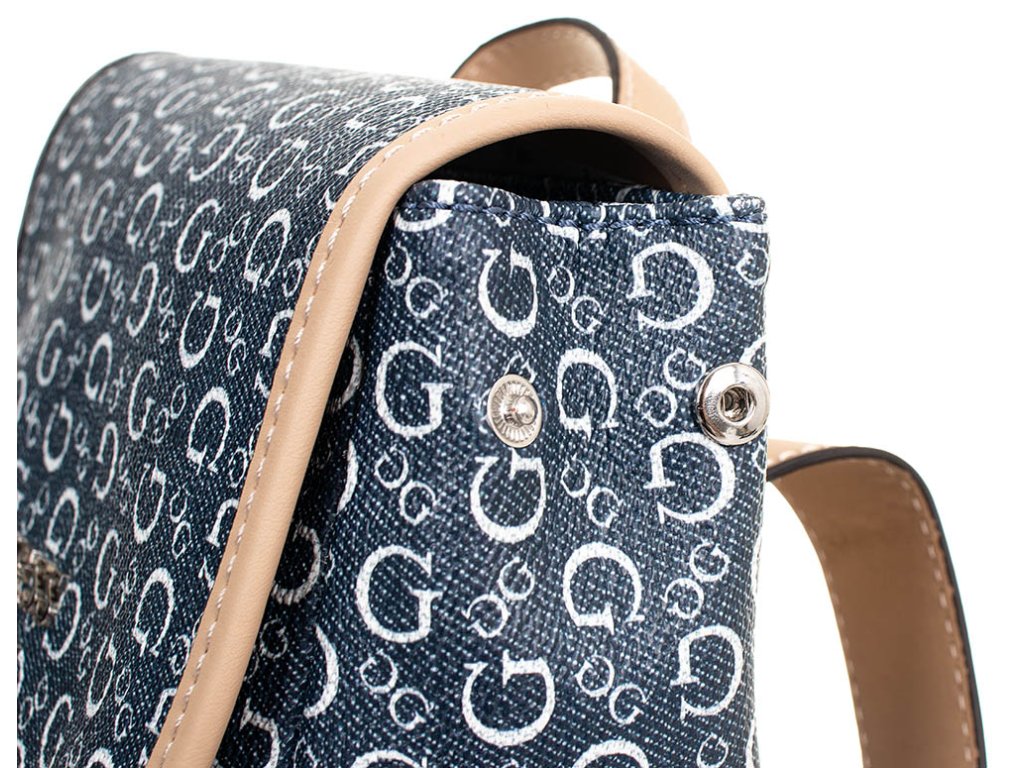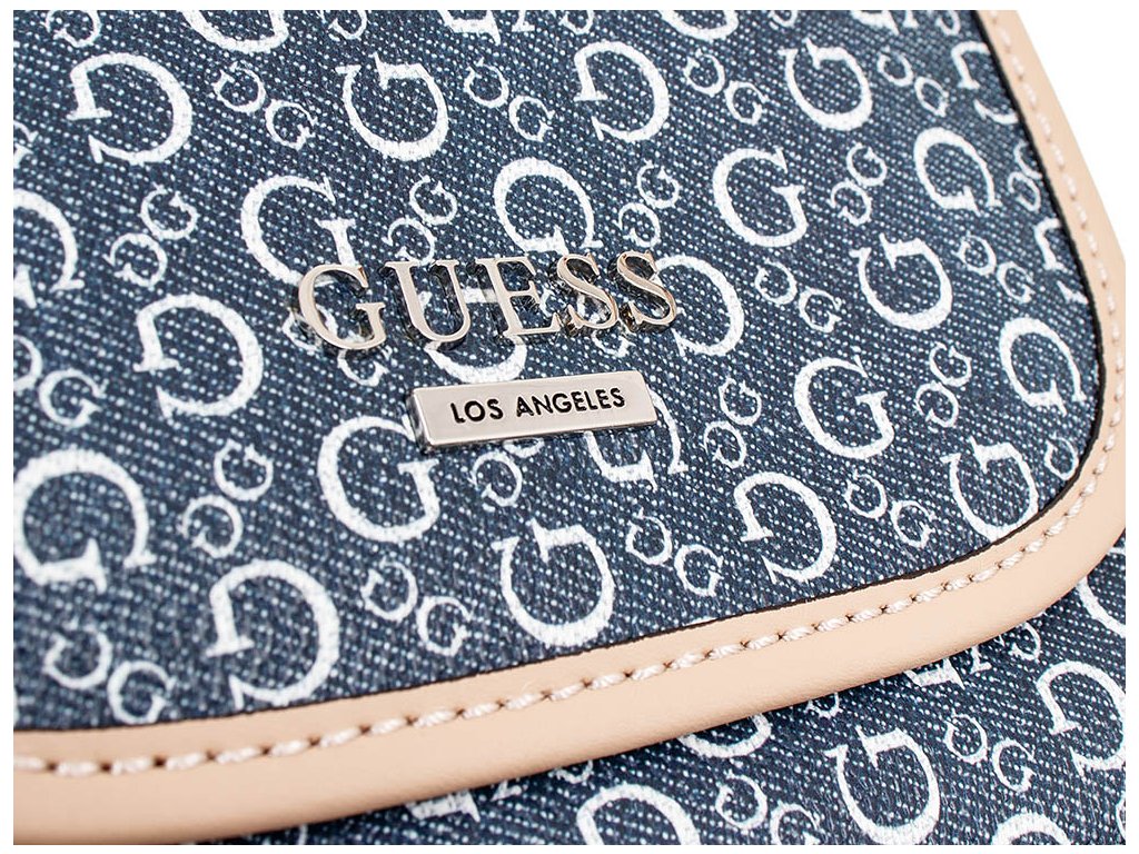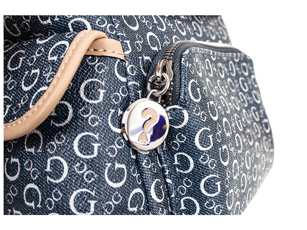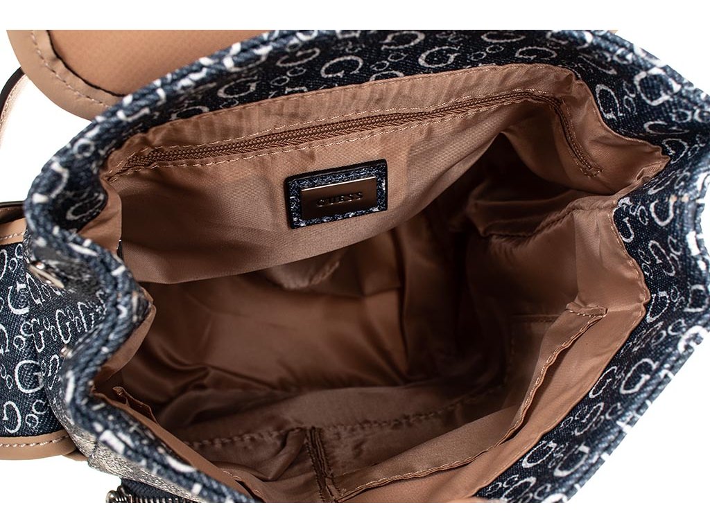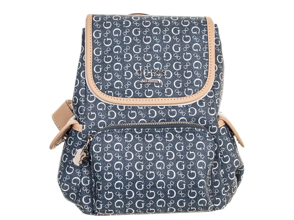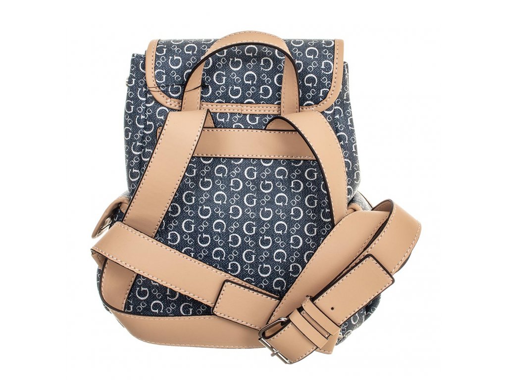 Tmavě modrý dámský malý batoh s bílým monogramem Guess, béžovými popruhy a lemováním. Po stranách a na bocích má kapsy na drobnosti a uvnitř je tmavě béžový s kapsami po stranách.