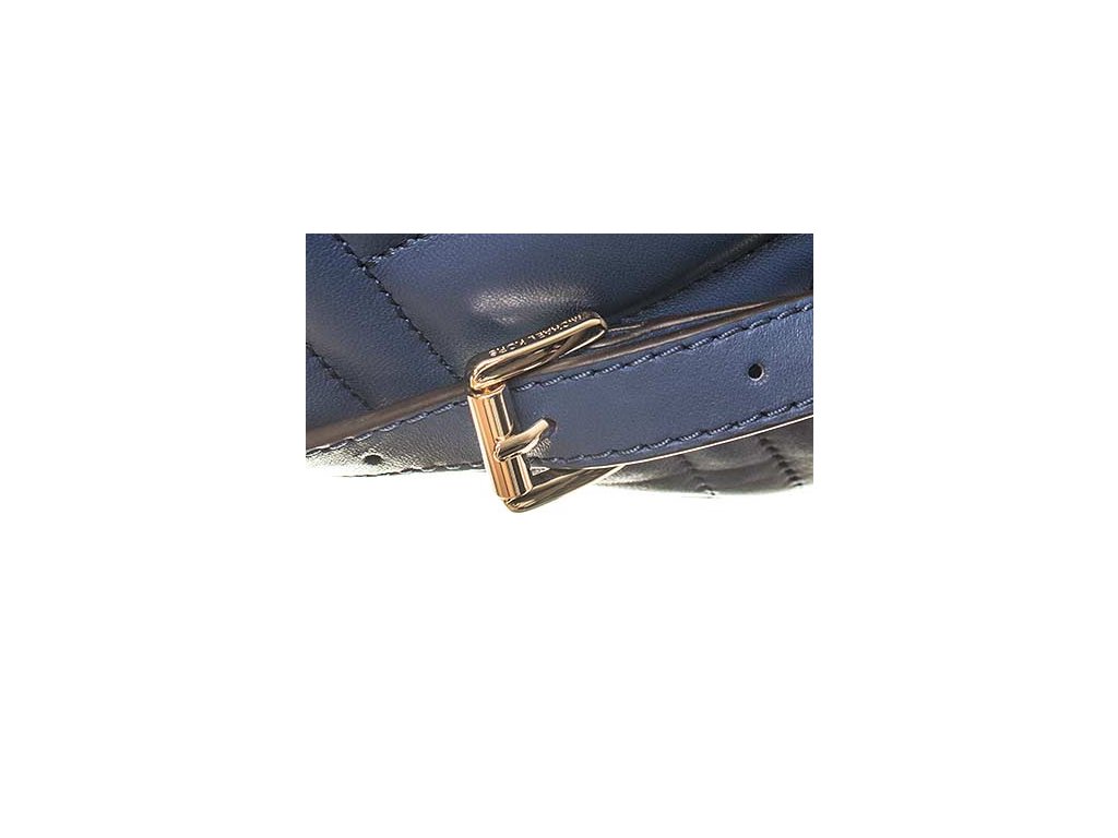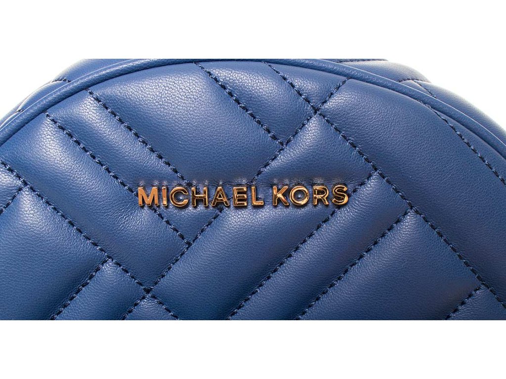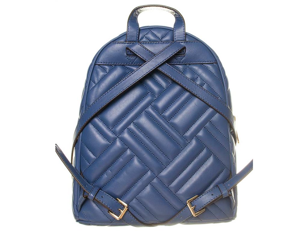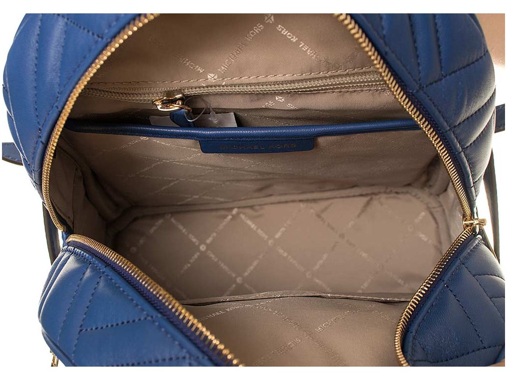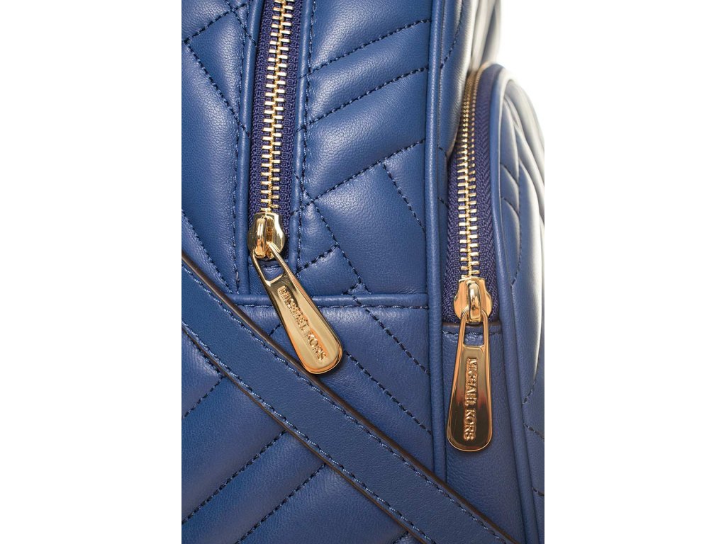 Dámský prošívaný batoh modré barvy od značky Michael Kors. Vpředu kovový nápis, kapsa na zip, v horní části poutko. Batoh má kožené popruhy nastavitelné pomocí přezky. Hlavní kapsa na zip, uvnitř velký úložný prostor s menšími volnými kapsami a kapsou na zip.