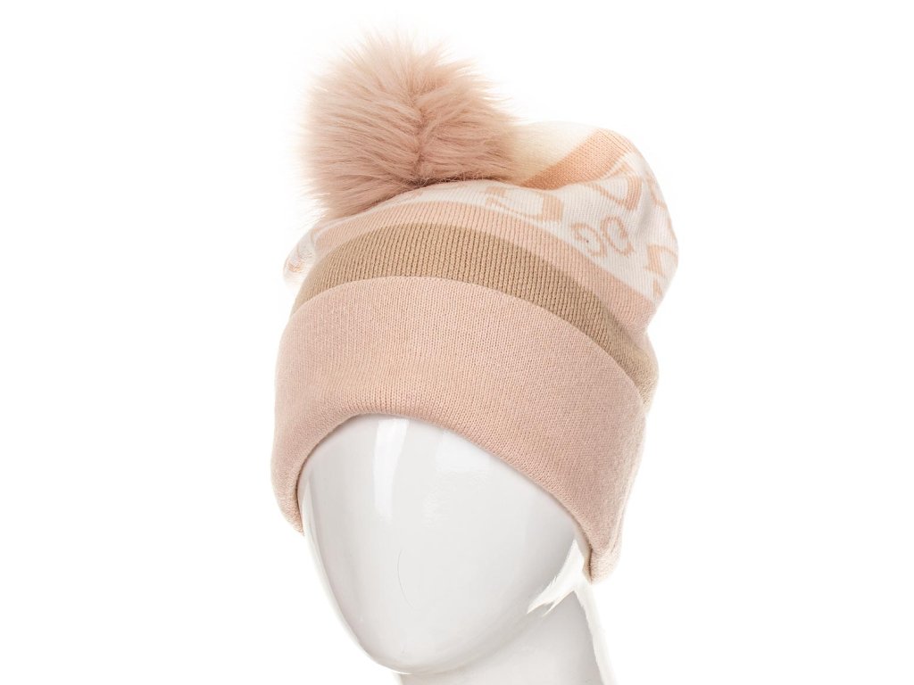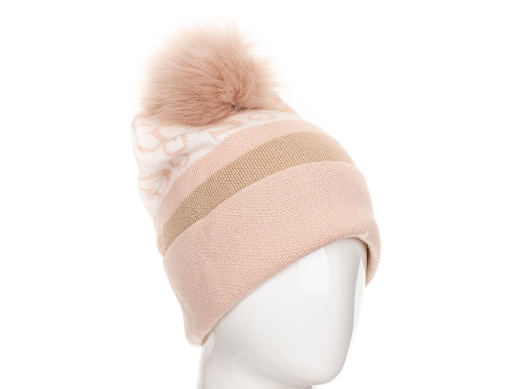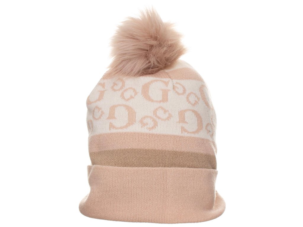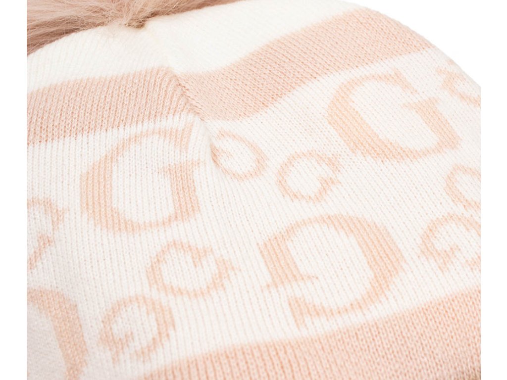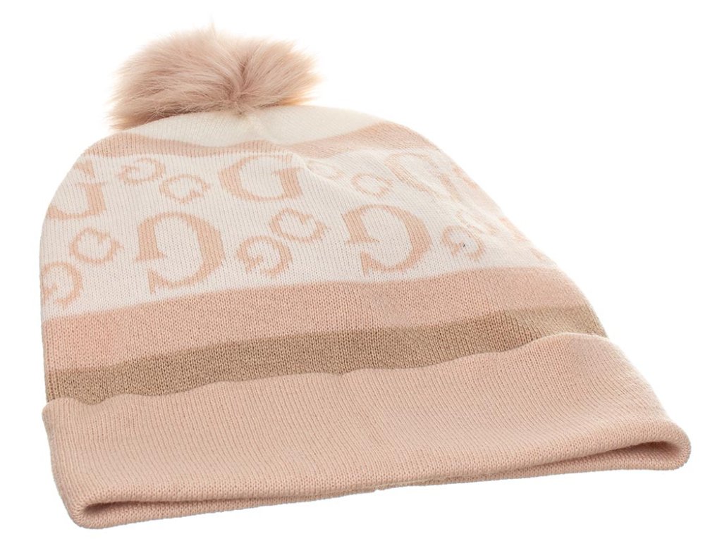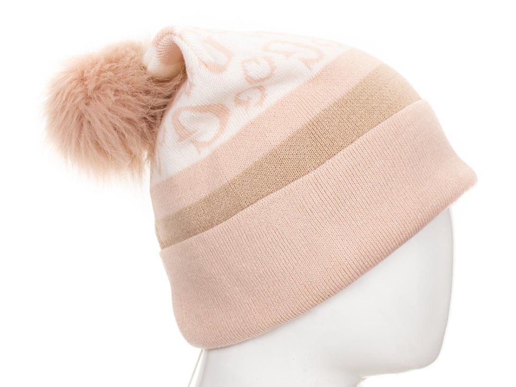 Dámská čepice Guess v pudrově růžovo krémové barvě s béžovou, s monogramem a bambulí. Příjemný teplý pružný materiál.