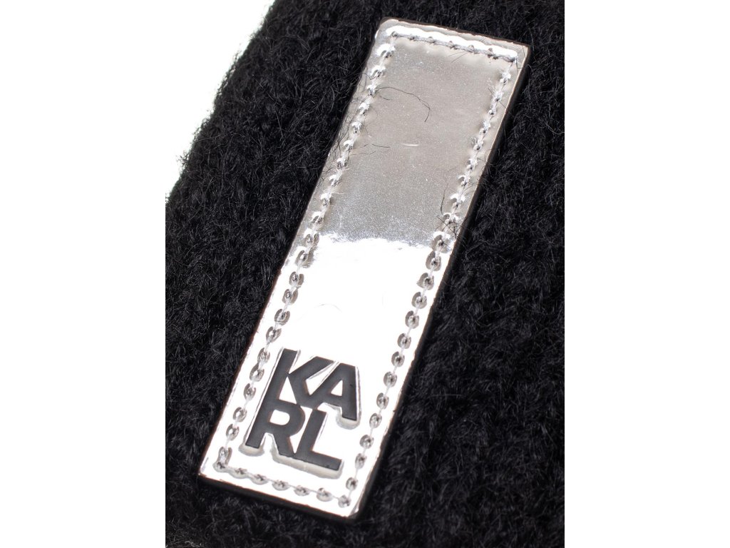 Dámská čepice Karl Lagerfeld v černé barvě se stříbrnou aplikací s logem. Příjemný teploučký materiál.