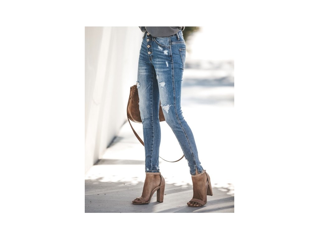 Trendy KanCan jeans. Krásné atraktivní, pružné džíny, které se dokonale přizpůsobí vaše postavě. Mají stylový vzhled, díky skinny střihu, potrhaným částem, knoflíkům v pase. V sytě modré barvě. Jednou vyzkoušíte tyto džíny a nebudete chtít jiné.
