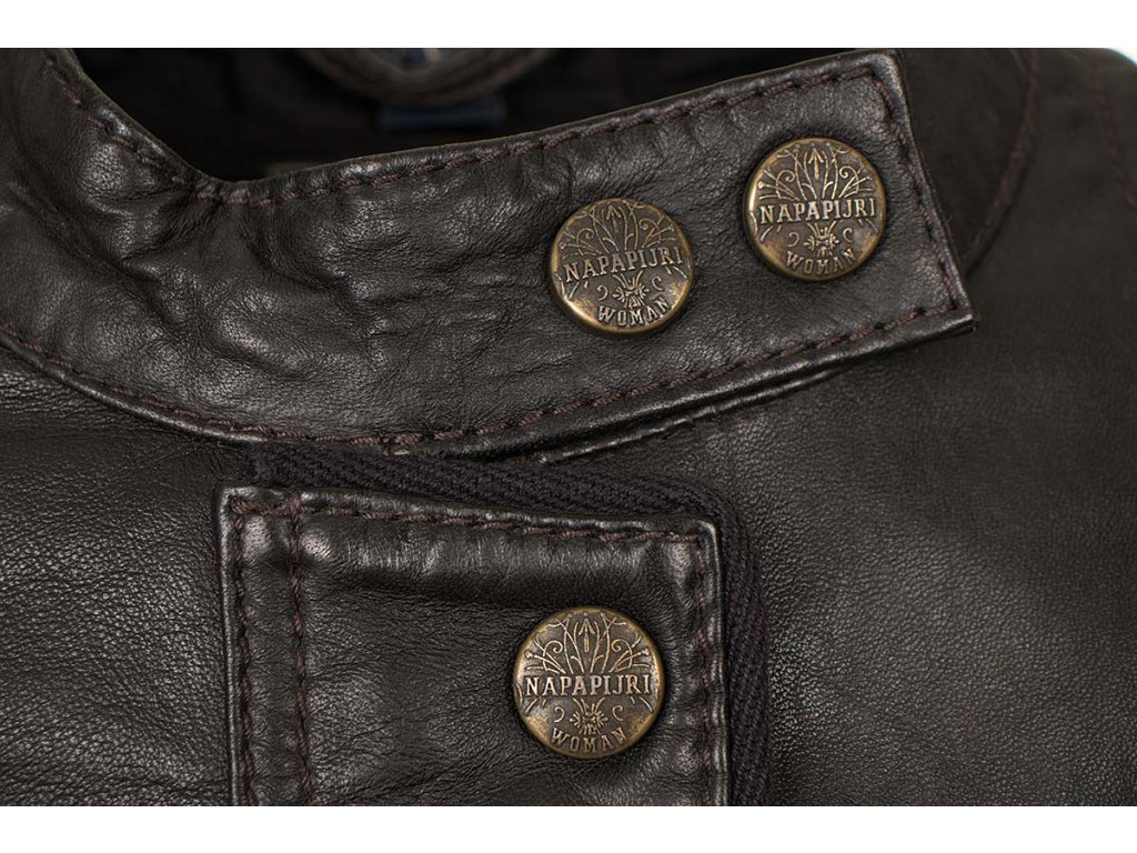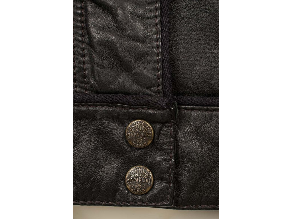 Dámská černá bunda z pravé kůže od Napapijri. Pěkně zpracovaná bunda s hlavním zapínáním na zip, límec lze zapnout kolem krku pomocí knoflíků. Knoflíky jsou detailně zpracované s nápisem "Napapijri". Bunda je zdobená pomocí prošívání, které naleznete po stranách, na ramenou, loktech. Vzadu na spodním lemu našitý nápis. Vpředu dvě kapsy na zip.