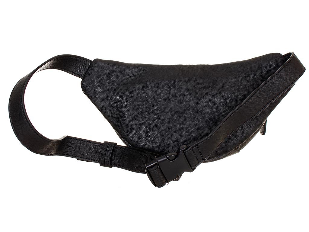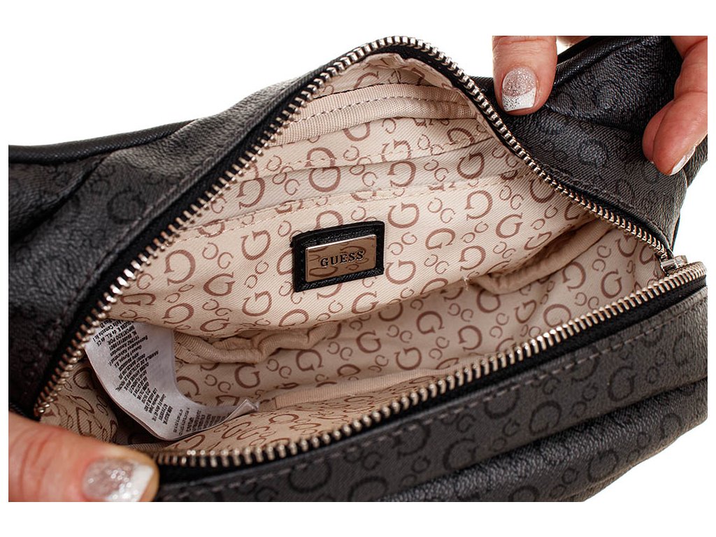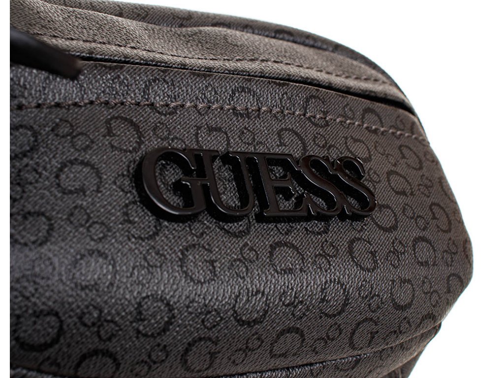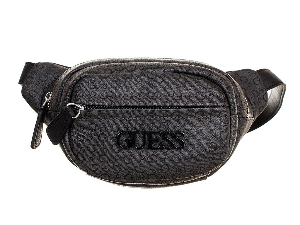 Tmavě šedá prostorná dámská ledvinka s černým Guess monogramem, na zip, s černým vystouplým nápisem. Uvnitř béžová s monogramem, na straně kapsa s kovovým okrasným plíškem.
