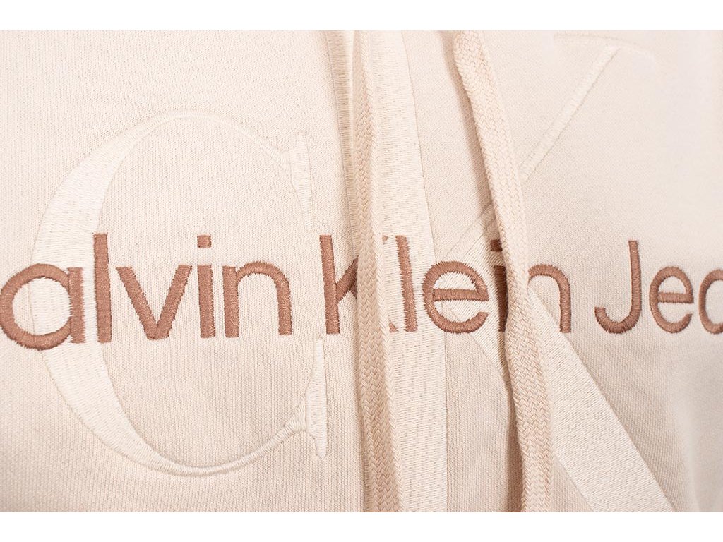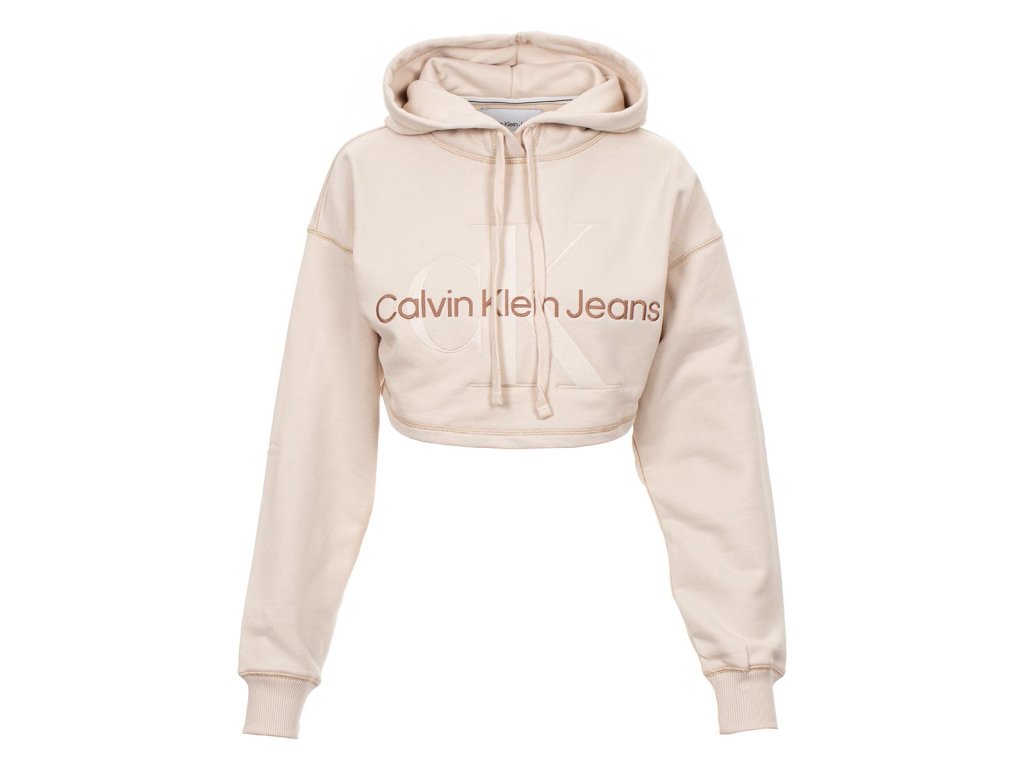 Dámská bavlněná crop mikina Calvin Klein s kapucí ve světlé béžové barvě s vyšívaným logem na prsou.