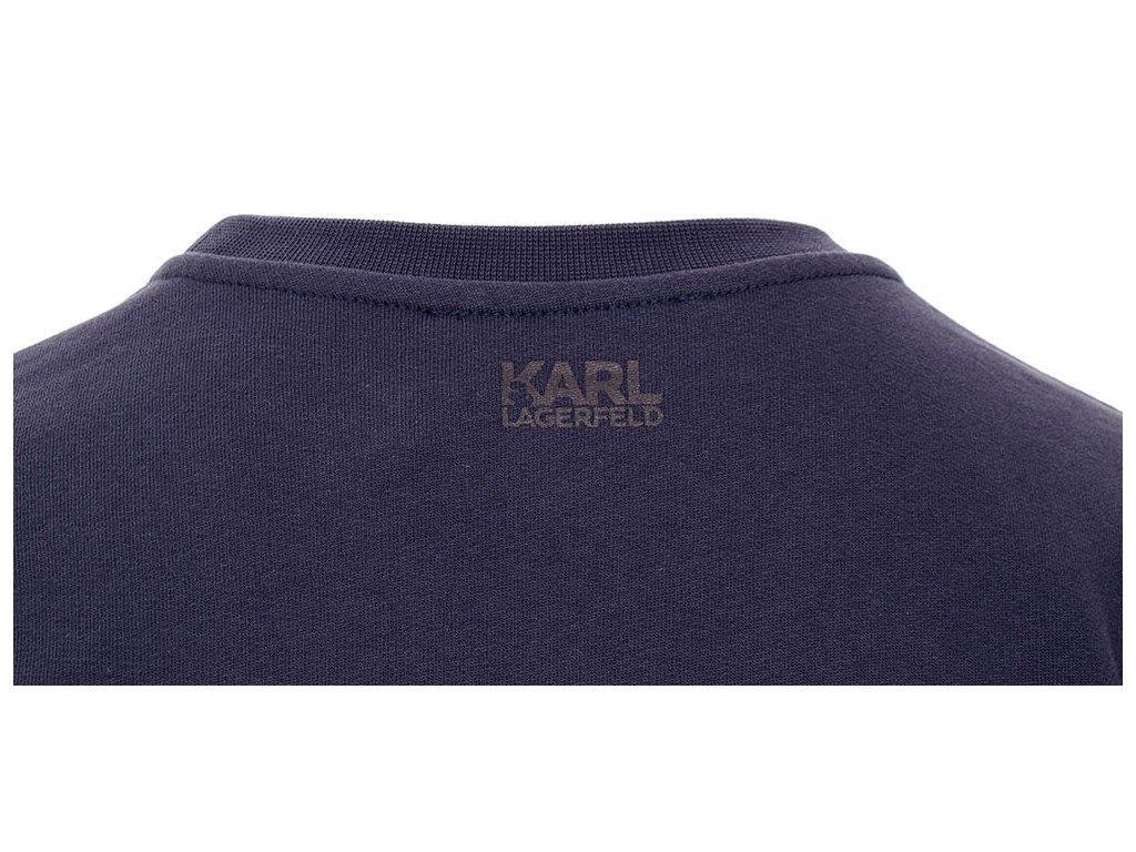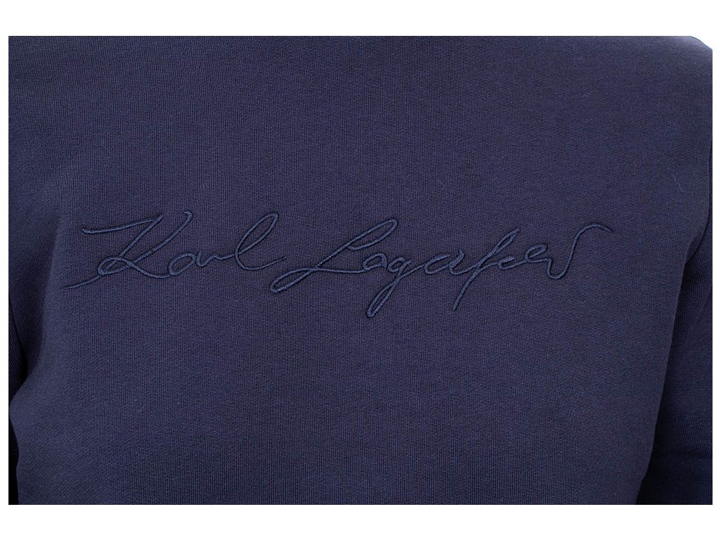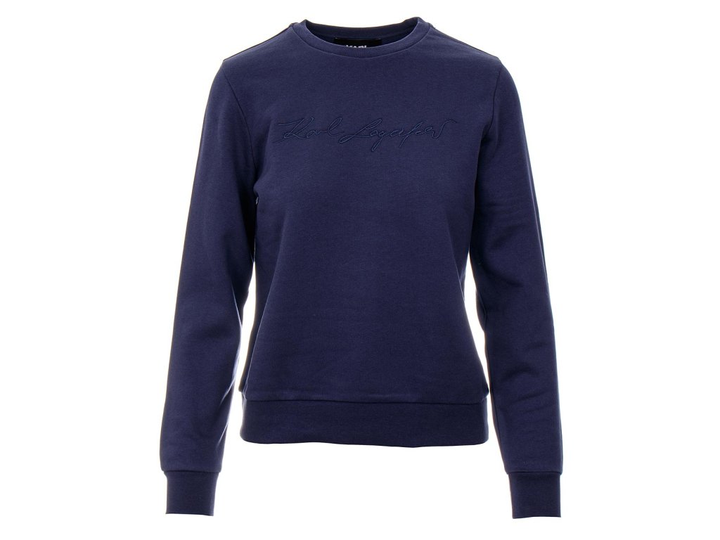 Dámská modrá mikina "Signature" od značky Karl Lagerfeld s modrou výšivkou podpisu návrháře Karla Lagerfelda na hrudi. Vzadu u krku vytištěné tmavé logo. Kulatý výstřih a pružné lemy v pase a na rukávech.