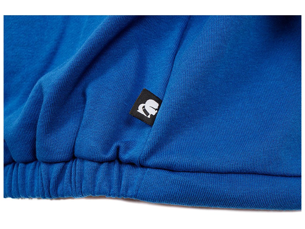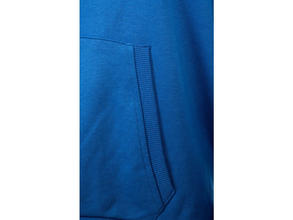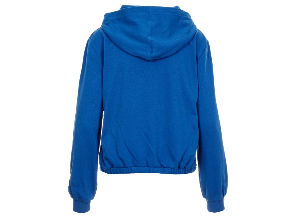 Modrá dámská mikina s kapucí a potiskem, v pase okrasná stahovací tkanička s logem, klokaní kapsa