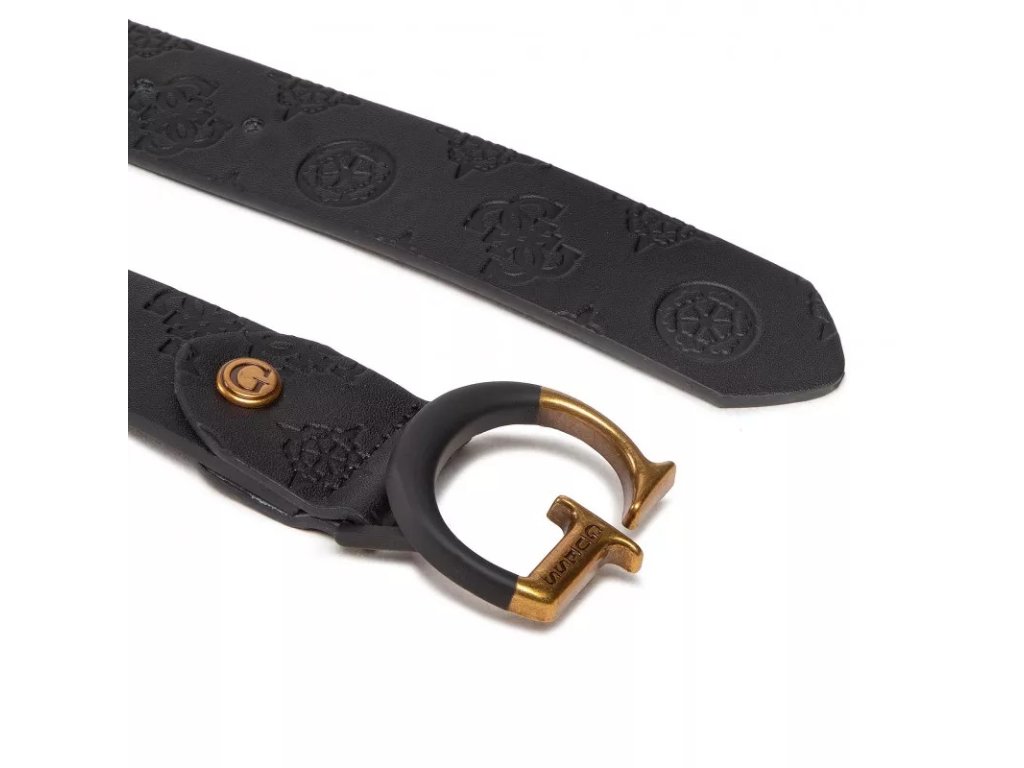 Černý dámský pásek Guess se zlatou sponou a vytlačeným monogramem.