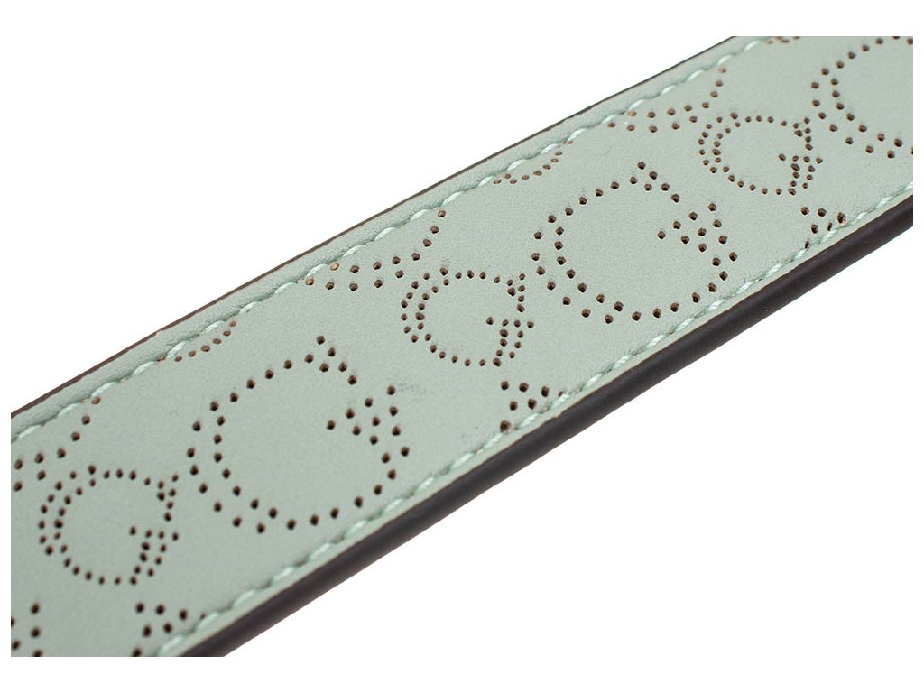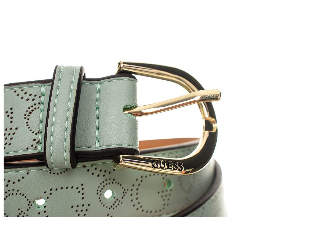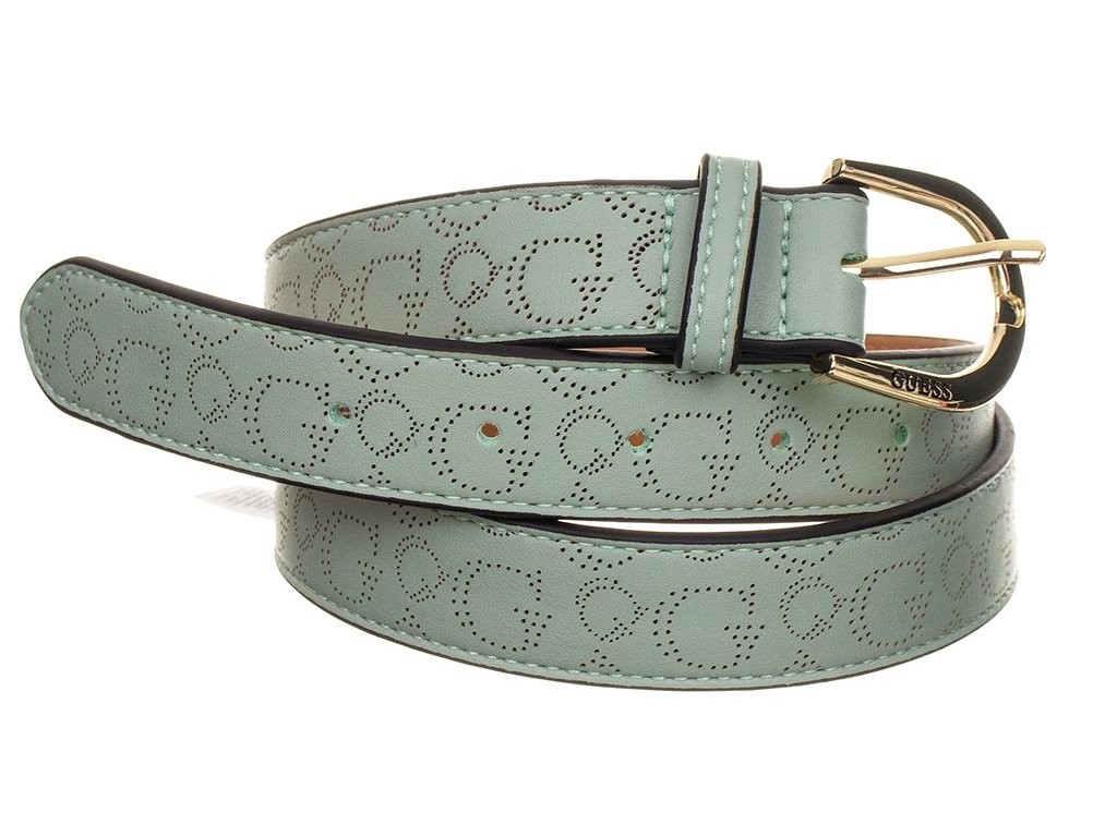 Dámský pásek Guess v krásné mint zelené barvě. Celý posetý monogramem G. Se zlatou kovovou sponou s vyrytým nápisem Guess.