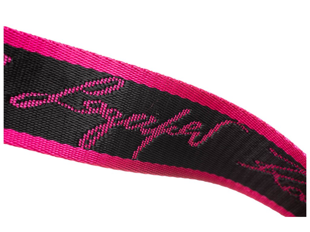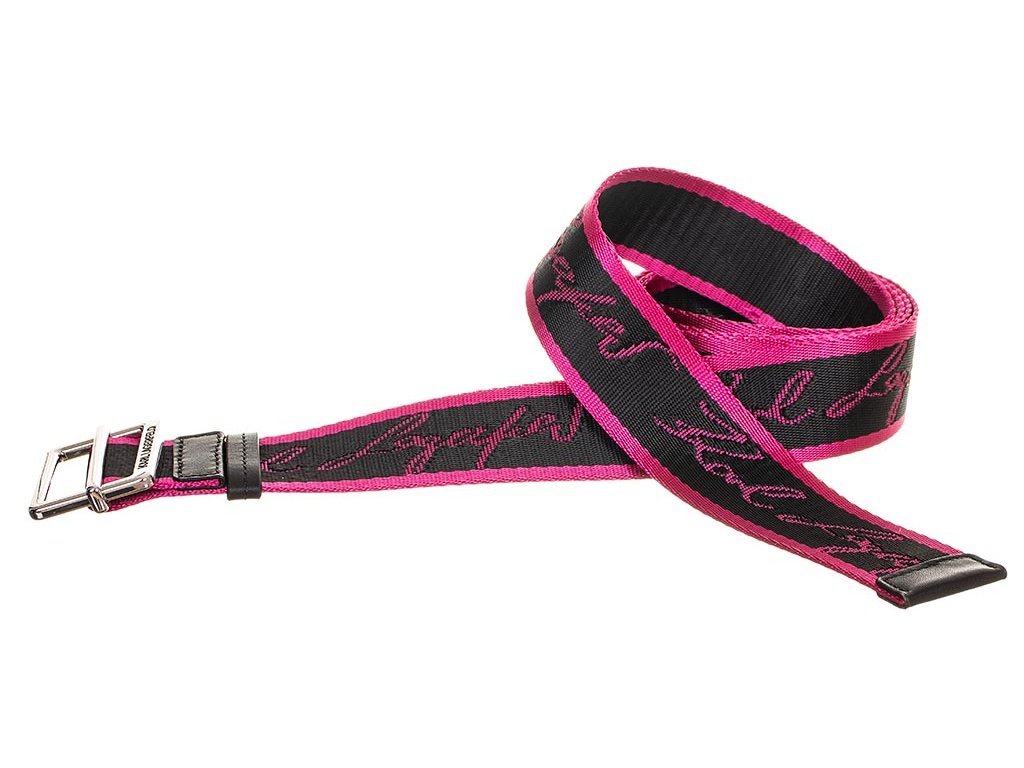 Dámský pásek od značky Karl Lagerfeld černo růžový s nápisy značky a stříbrnou přezkou.