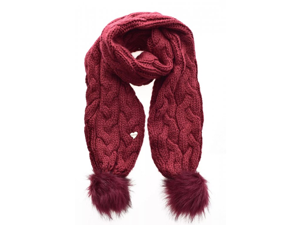 Krásná dámská šála ve vínové barvě. Konce zakončeny chlupatými bambulkami. Šála je z měkoučkého materiálu zdobená zlatým srdíčkem s nápisem Guess.