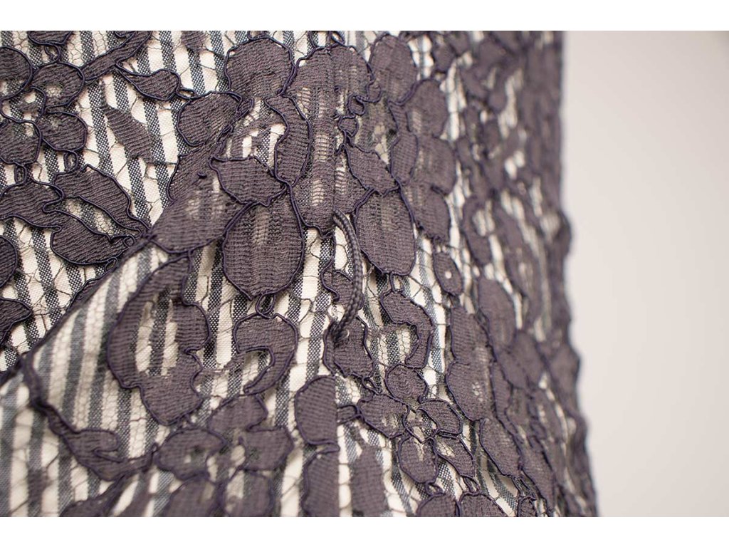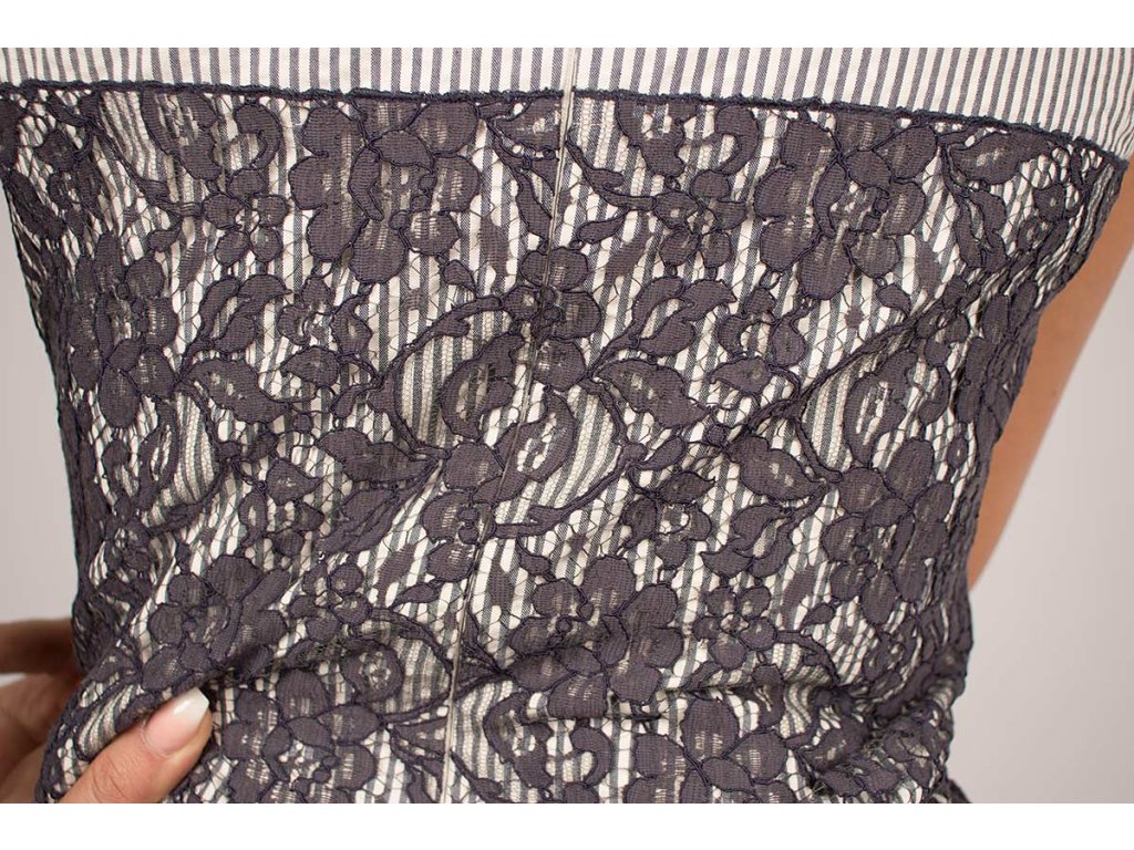 Pěkné pruhované šaty od značky Gant. Šaty jsou zdobený krajkovým vzorem a koženým páskem. Na zádech je skrytý zip po celé délce. Tento kousek je laděný v kombinaci modré a bílé barvy.