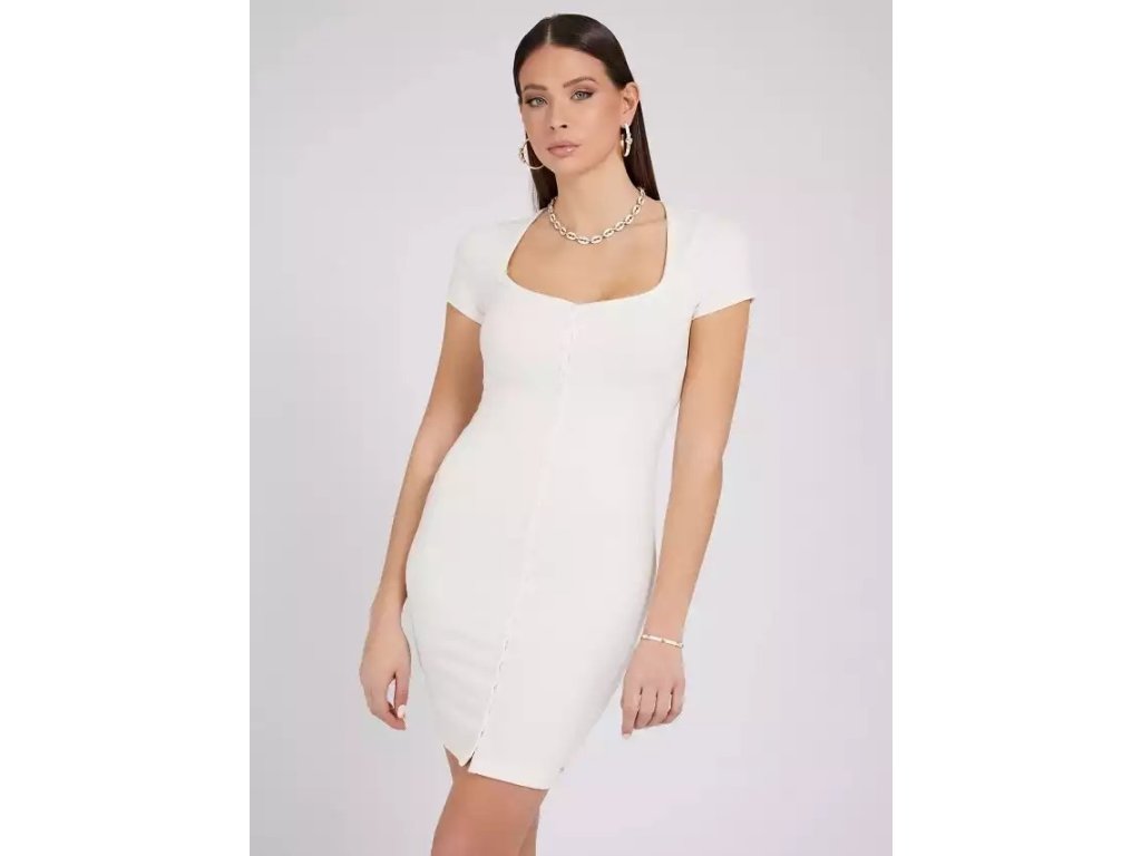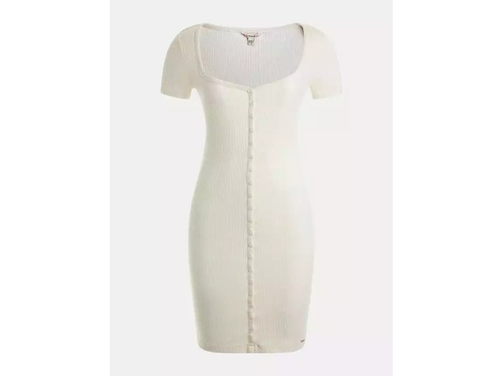 Dámské pružné šaty Guess v krémové barvě. Zdobené propínáním na knoflíky s logem. V dolní části kovová placka s vyrytým logem.