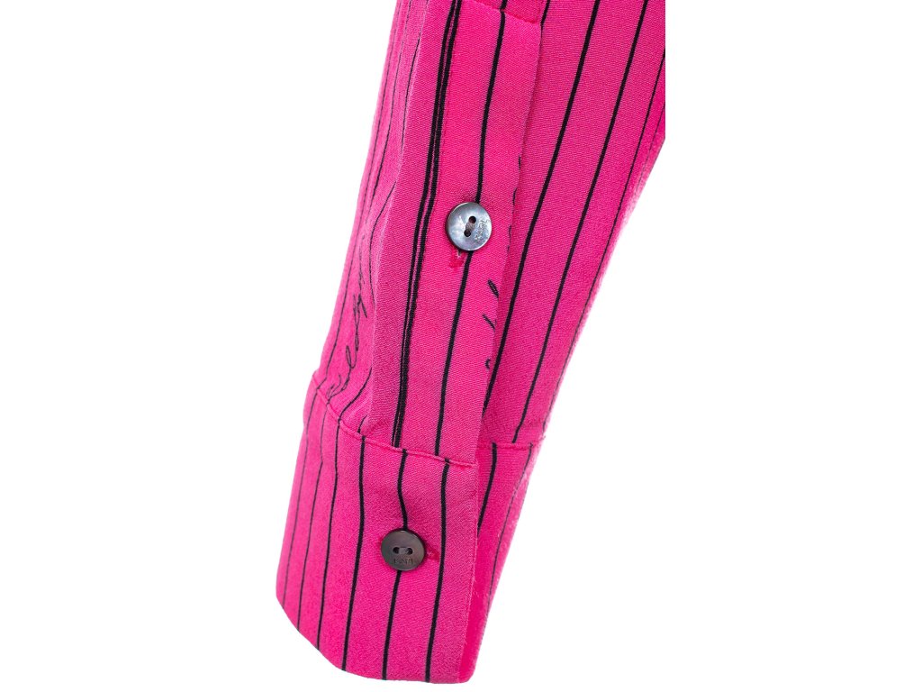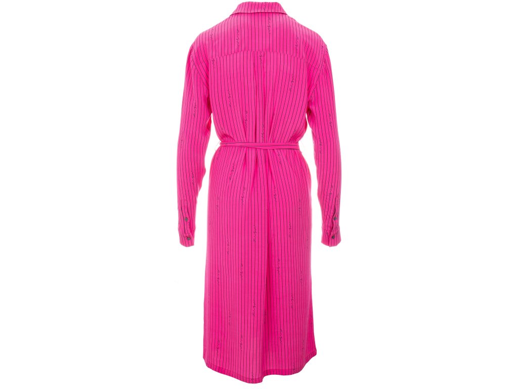 Dlouhé dámské košilové šaty "Logo Shirt" značky Karl Lagerfeld v neonově růžové barvě, s proužky a páskem. Mezi proužky je zajímavě zakomponován autogram návrháře. Zapínání na šatech je na knoflíčky a taktéž i na rukávech. Na knoflíčkách je vyryt název "KARL".