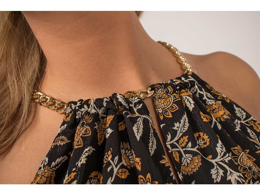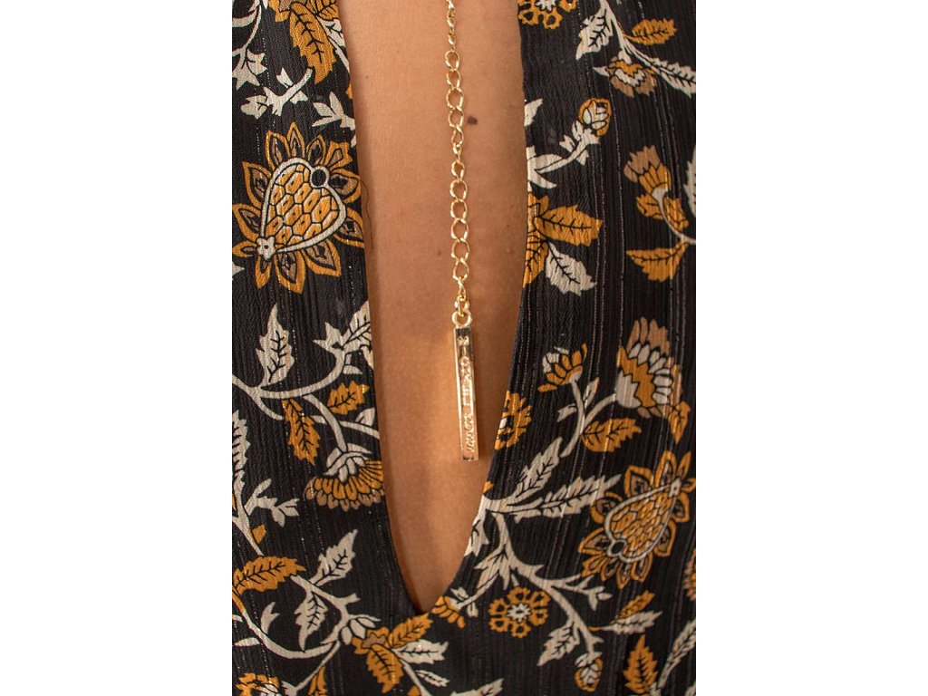 Nádherné černé šaty značky Michael Kors. Květinový vzor v bílo zlaté barvě. Okouzlující šaty se zlatým řetízkem který spojuje celou vrchní část šatů.