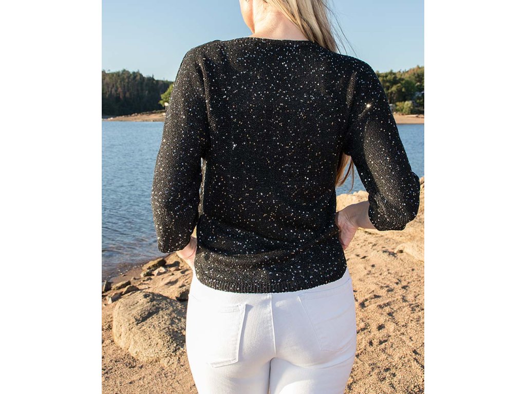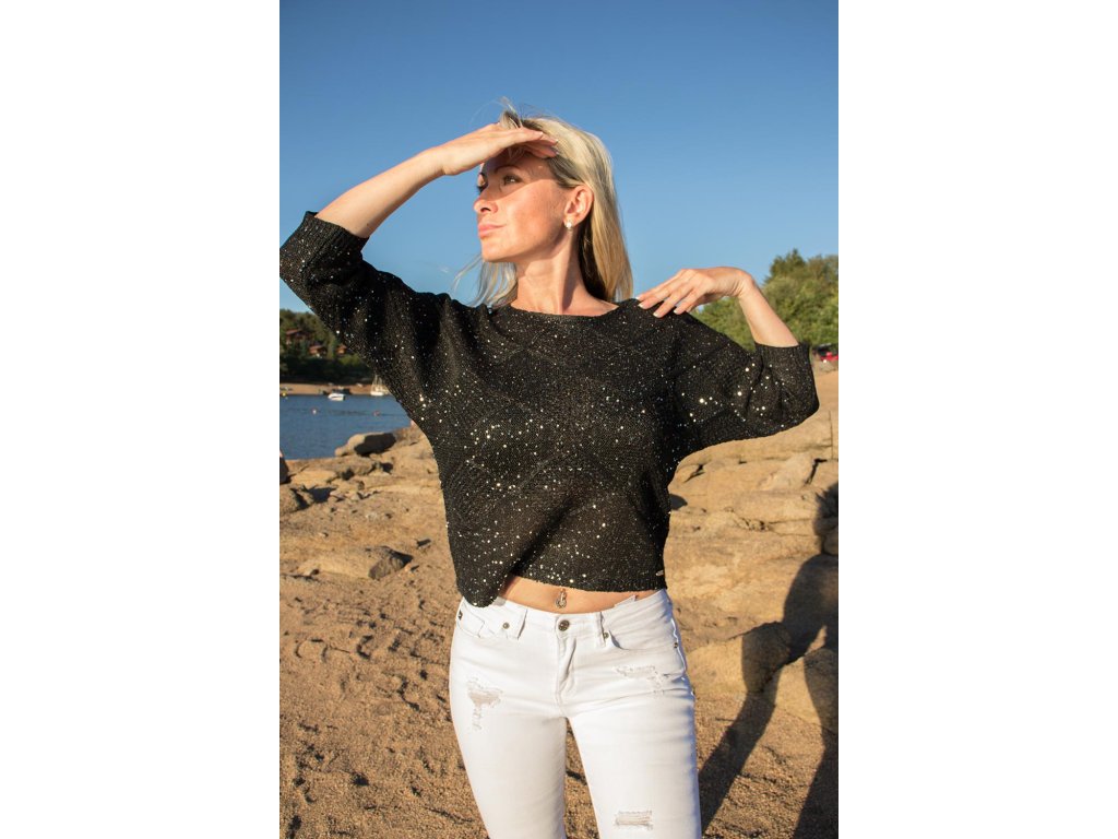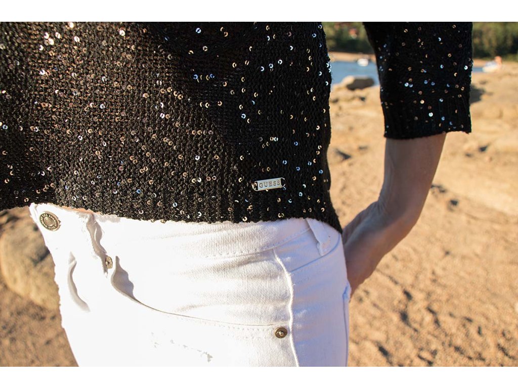 Dámský svetr značky Guess. Krásný lehký svetr s tříčtvrtečním rukávem v černé barvě se stříbrnými flitry. Na přední části jsou vyšité ornamenty. Svetr má zajímavý střih, přední část je kratší než zadní část.