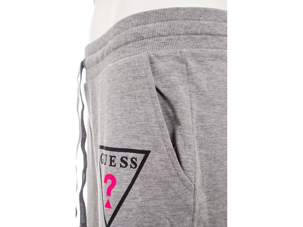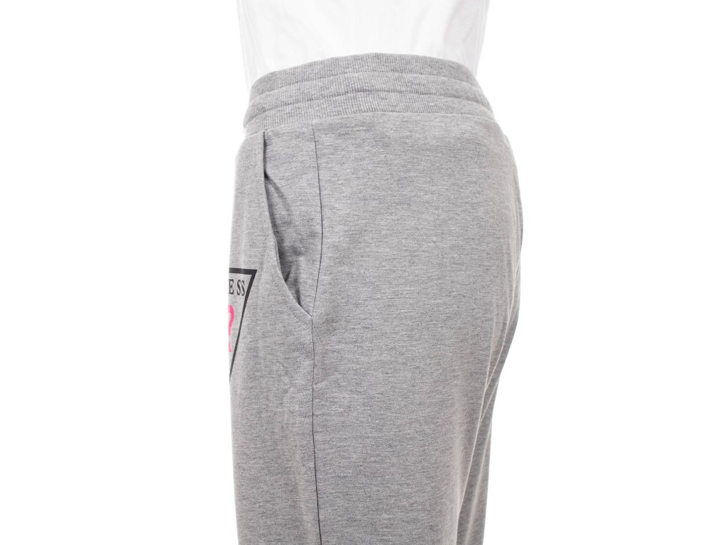 Dámské tepláky značky Guess v šedé barvě. Klasické tepláky mírně vyteplené fleesem, s pružnými lemy v pase a u kotníků, na zavazování v pase, na bocích dvě volné kapsy a u pasu je potisk loga GUESS.
