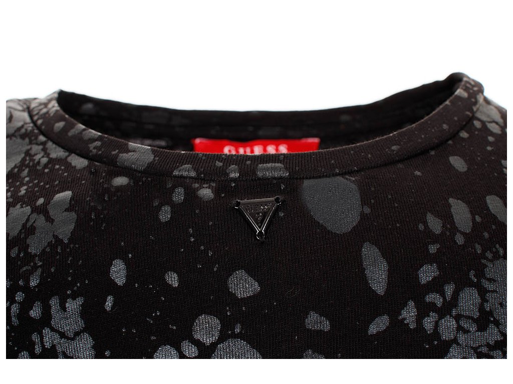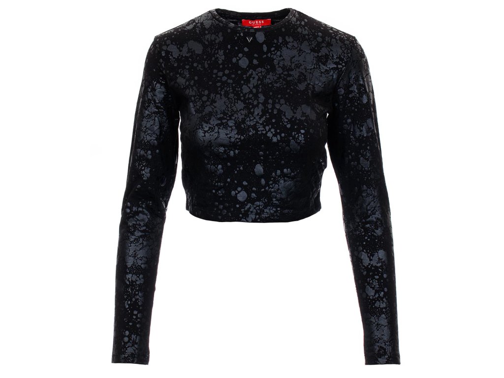 Dámský crop top Guess v černé barvě s černým mírně lesklým potiskem. U krku zdobený kovovým trojúhelníčkem s vyrytým logem.