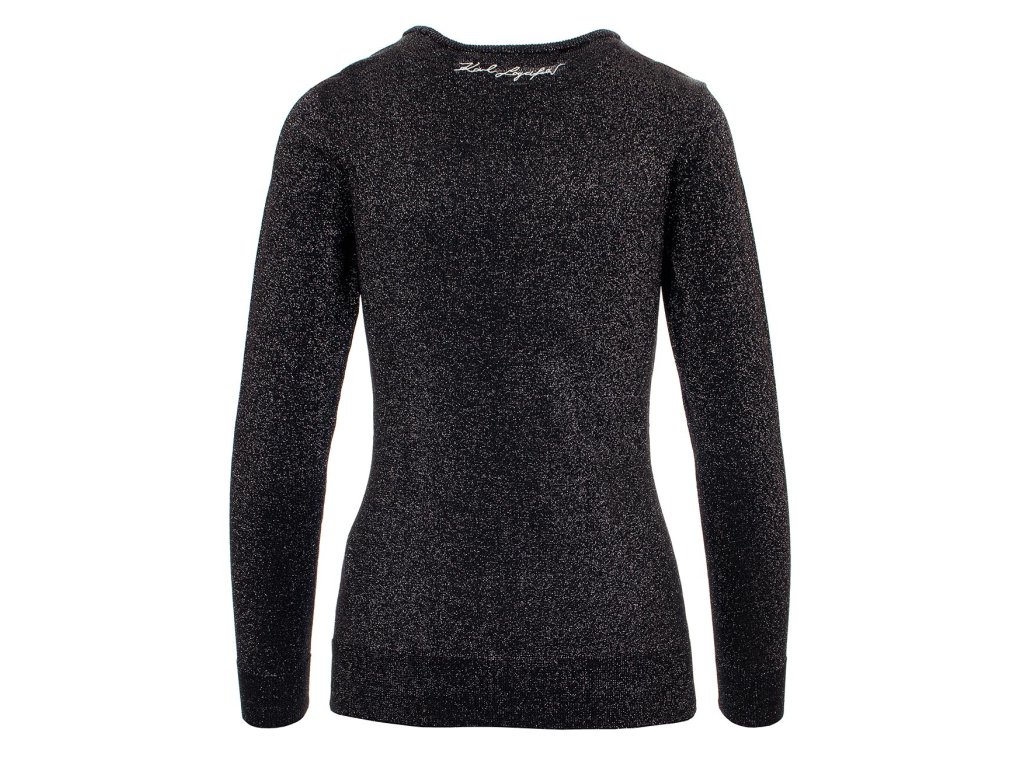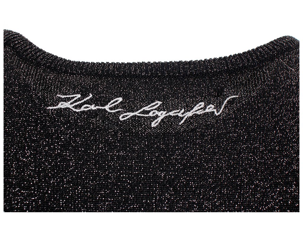 Luxusní tenký svetr Karl Lagerfeld, který bude vypadat báječně jak na párty, tak v práci. V černé barvě protkaný stříbrným vláknem. Zajímavě střihově řešený, na zádech za krkem stříbrně vyšité logo Karl Lagerfed.