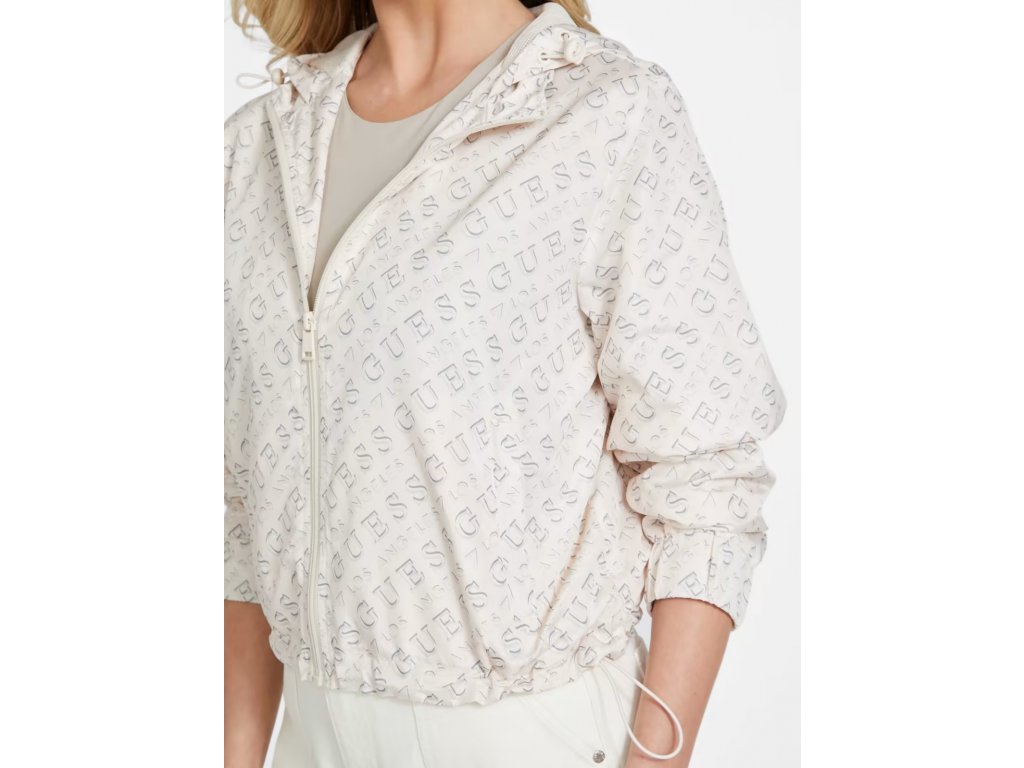 Dámská větrová bunda Guess . V krémové barvě, posetá šedým logem, podšitá, v dolním kraji a kapuci pružná šňůrka, kterou utáhnete pomocí olivky. Dvě funkčí kapsy na zip.
