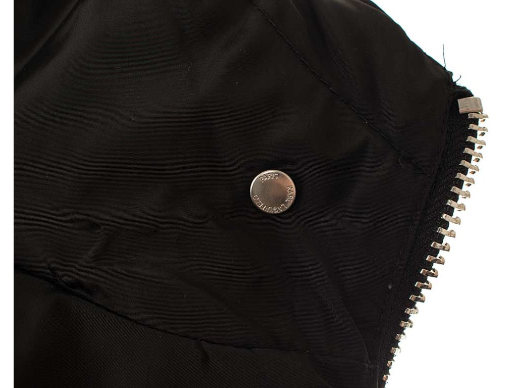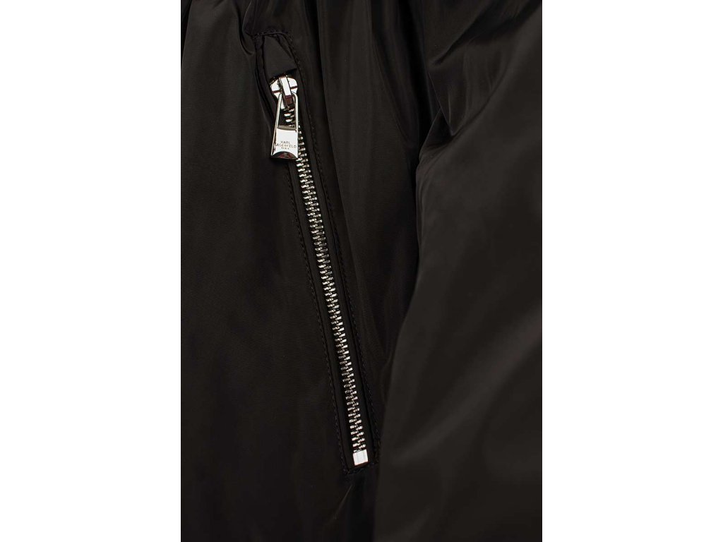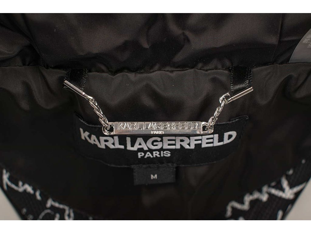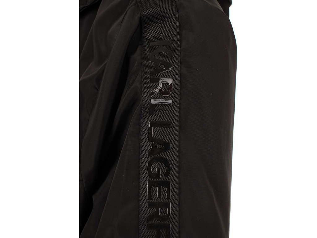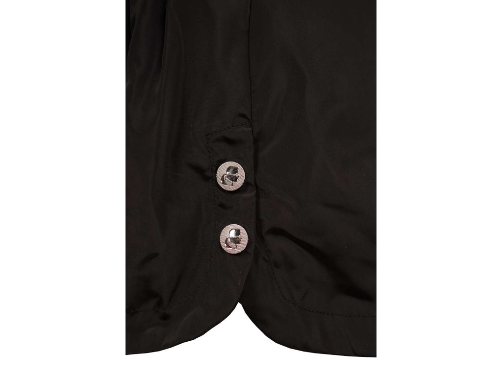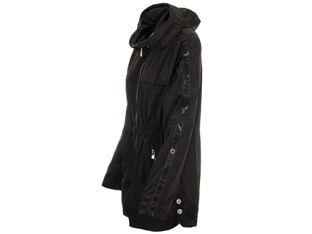 Dámská bunda tzv. větrovka značky Karl Lagerfeld. Vhodná bunda do podzimního počasí. Elegantní v černé barvě a s kapucí. V pasu se dá stahovat pomocí šnůry, po stranách kapsy na zip, stejně tak rozparky na zdobené knoflíky, podél rukávů pásek s nápisem "Karl Lagerfeld"