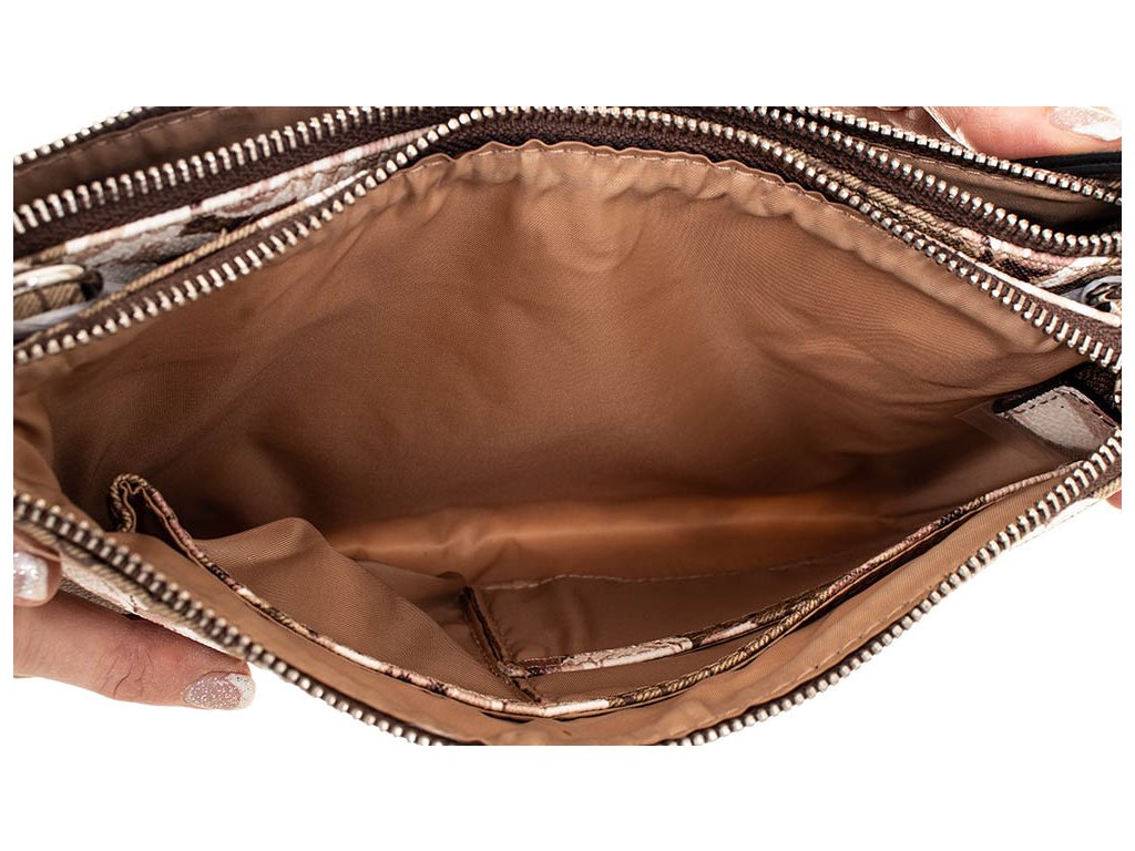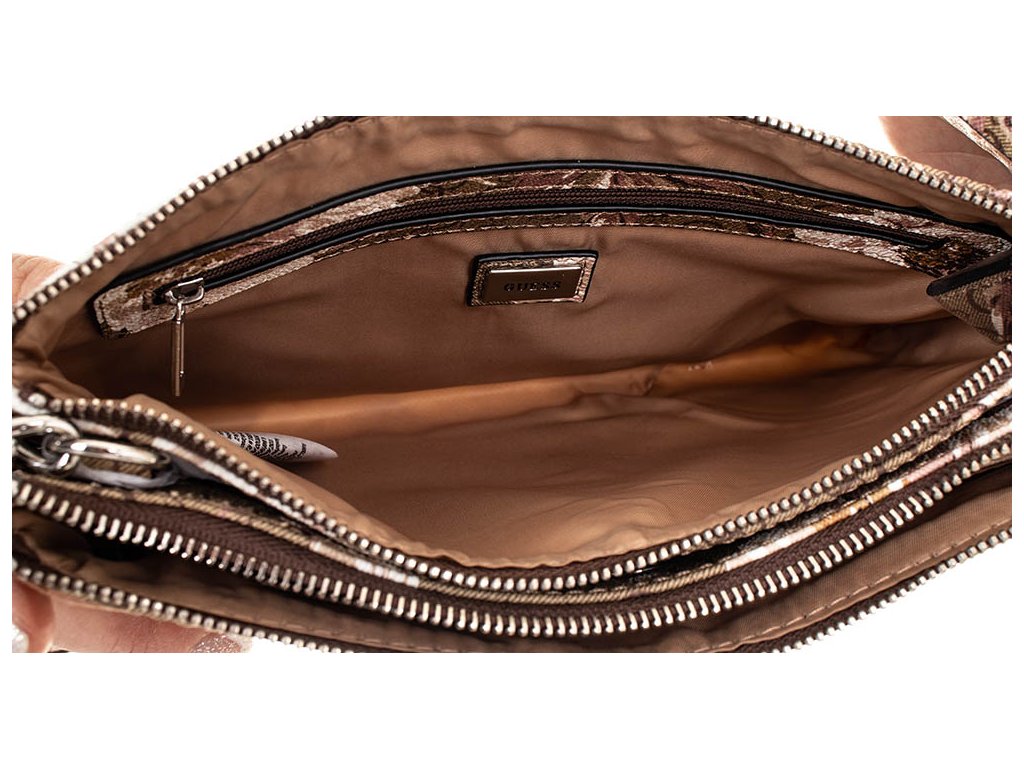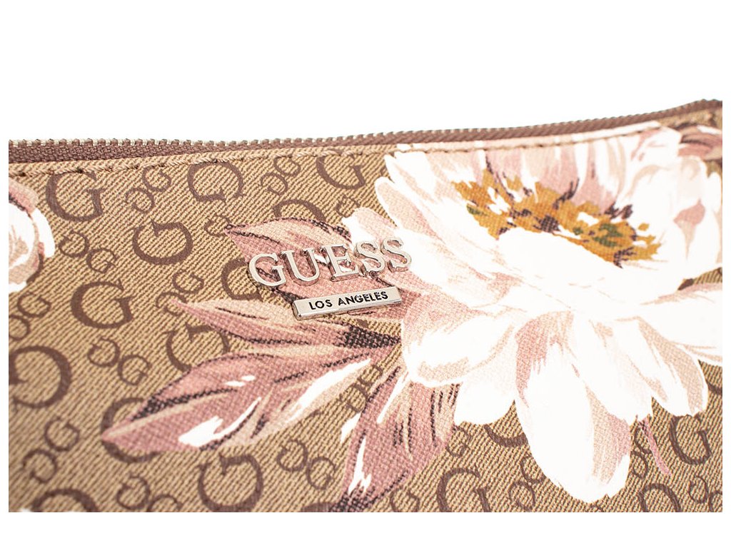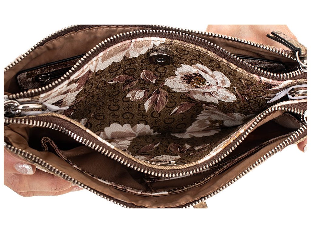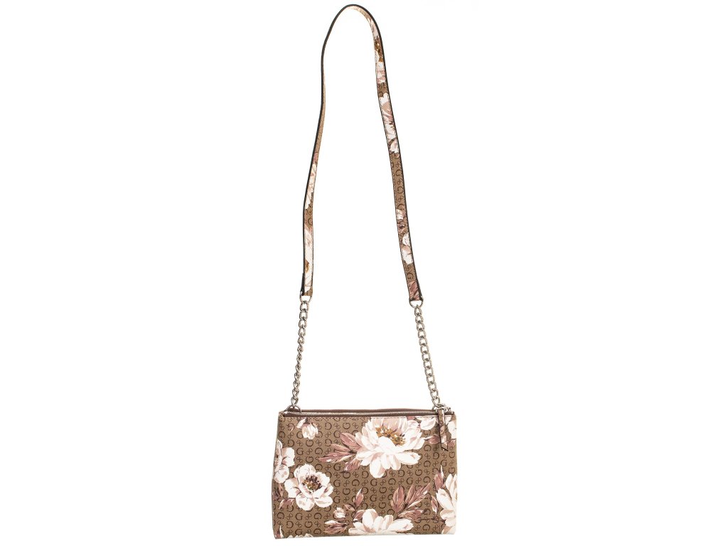 Dámská kabelka s květinami barvy mocha multi s tmavě hnědým monogramem Guess a řetízkovým popruhem. Obsahuje dvě prostorné kapsy, které mají po stranách kapsy na drobnosti, a jednu kapsu uprostřed.