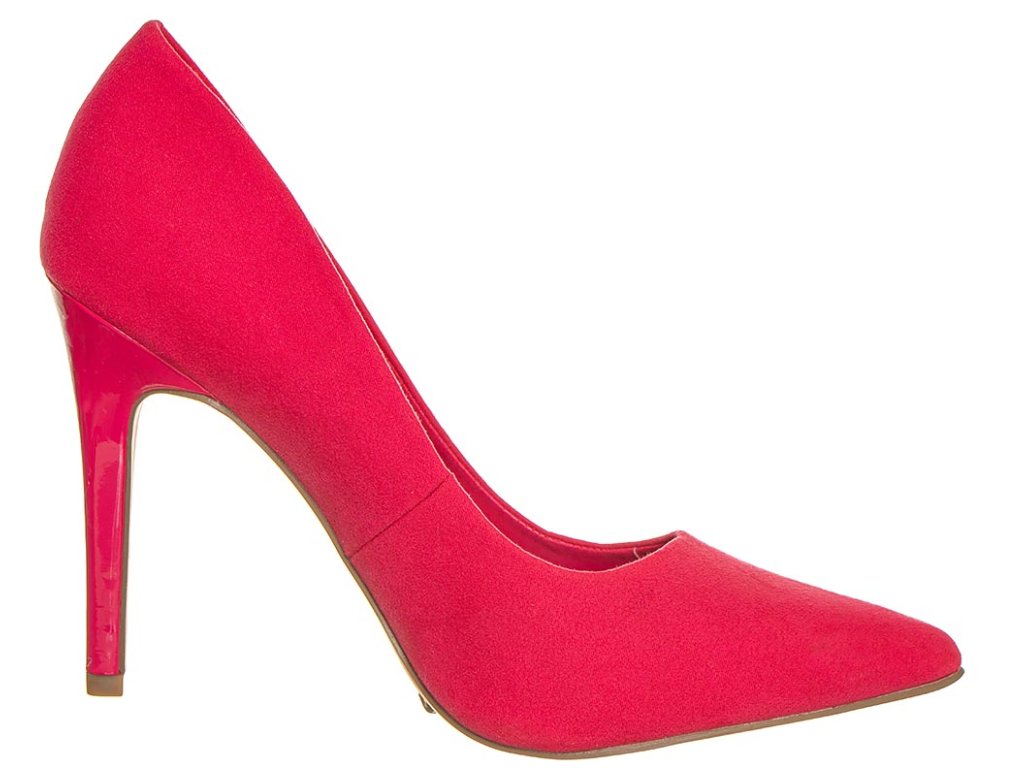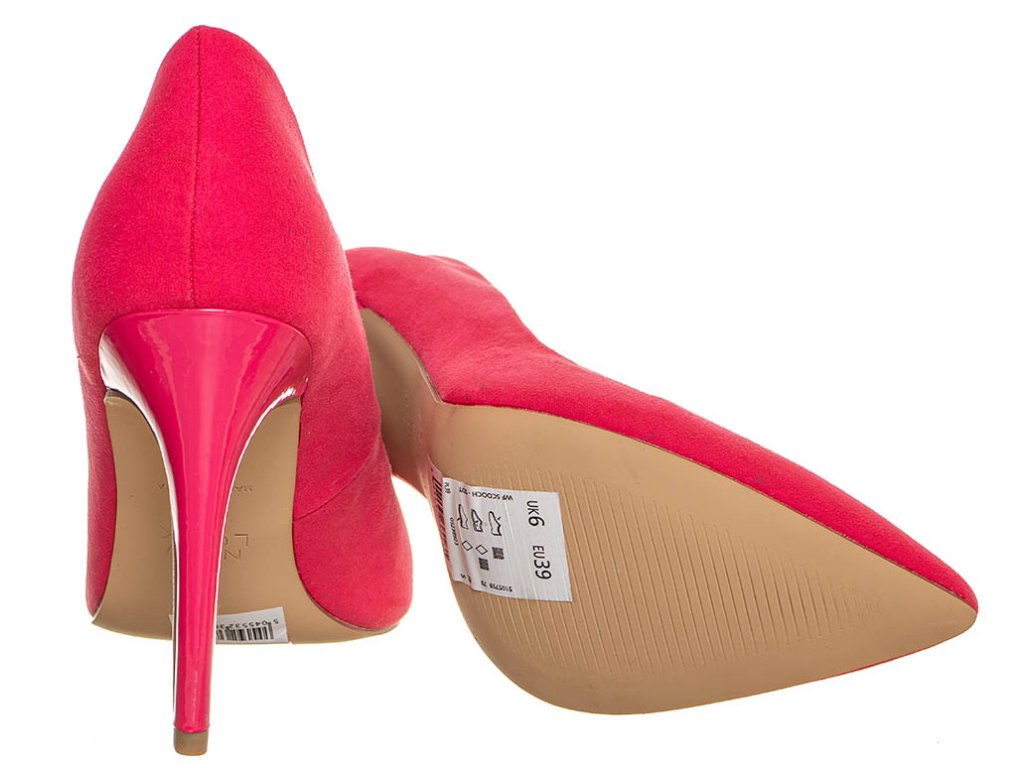 Semišové lodičky na jehlovém podpatku s úzkou špičkou od značky New Look v růžové barvě.