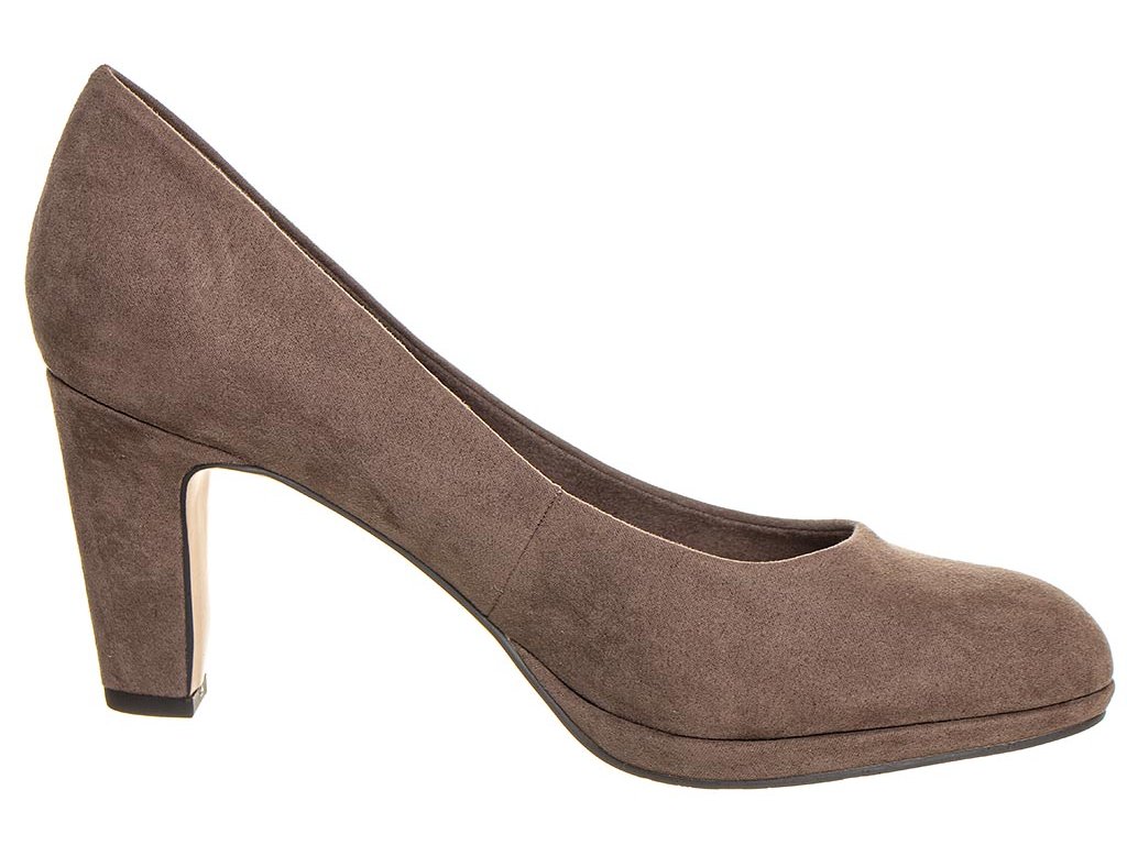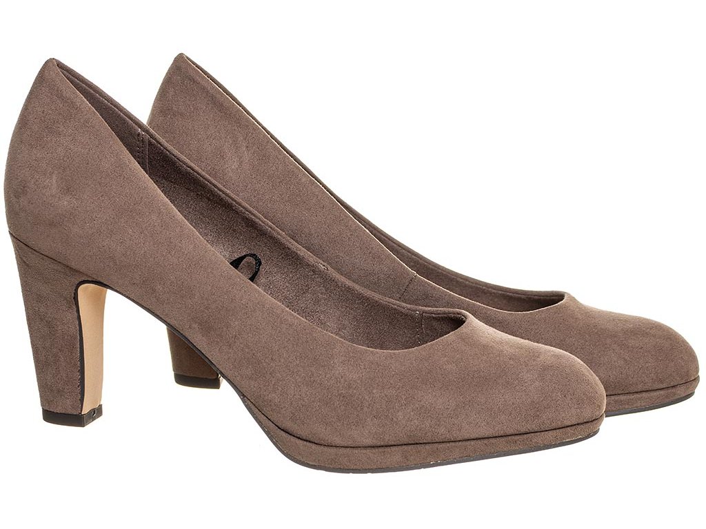 Hnědé semišové lodičky značky Tamaris na podpatku a menší platformě s kulatou špičkou.