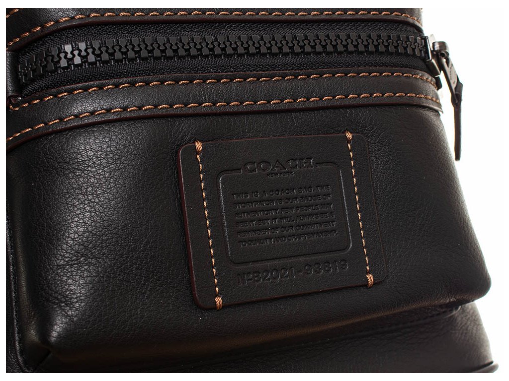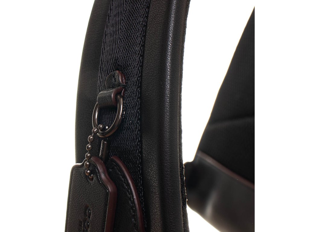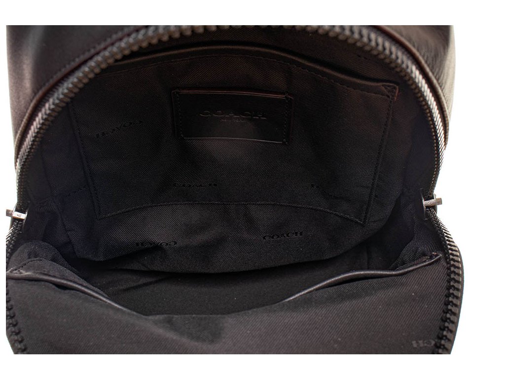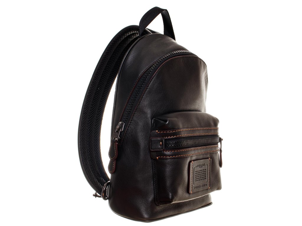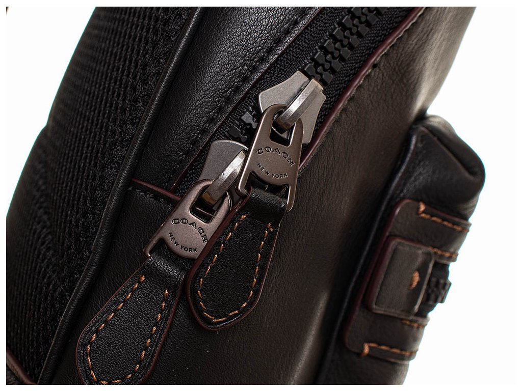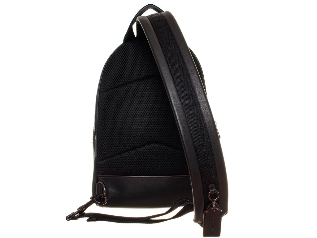 Pánský nebo unisex kožený batoh značky Coach New York v černé barvě s hnědým prošíváním. Z vnější strany jedna kapsa na zip, uvnitř dvě volné kapsy. Vypolstrovaná záda i ramenní nastavitelný popruh, který lze libovolně připnout na kteroukoliv stranu pomocí karabiny. Veškeré kovové detaily v černé barvě a vyrytým názvem značky.