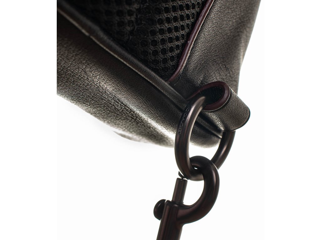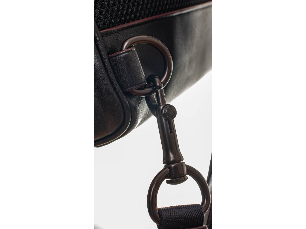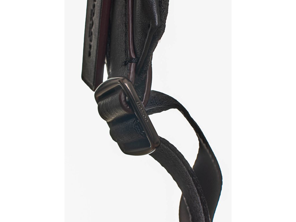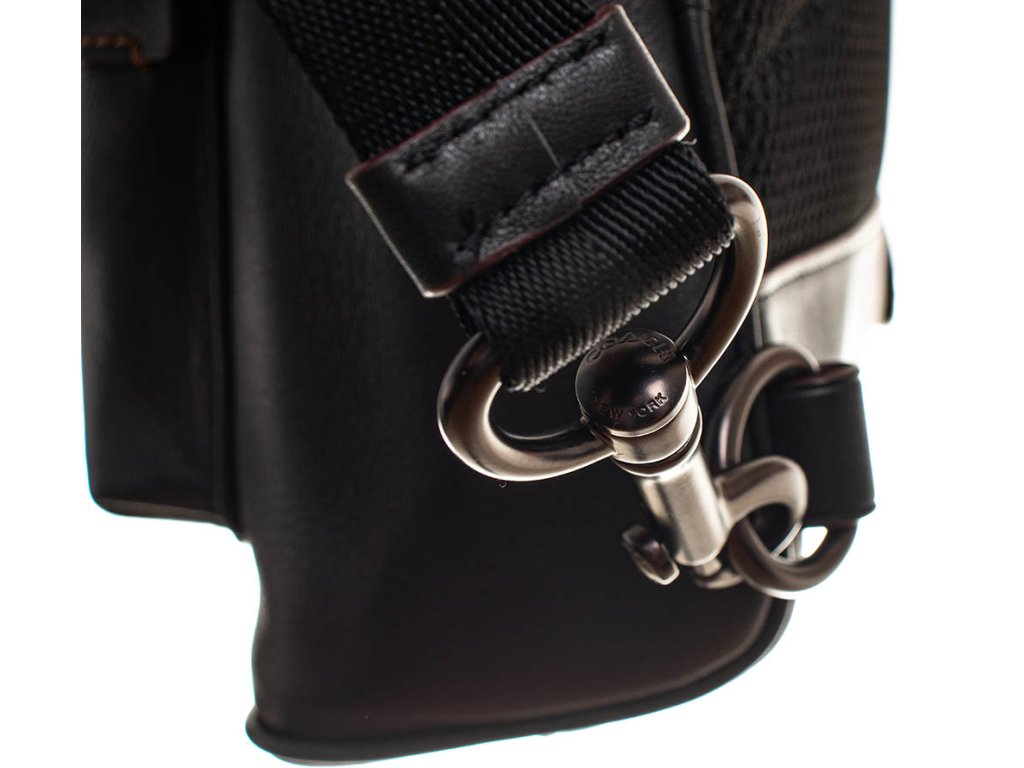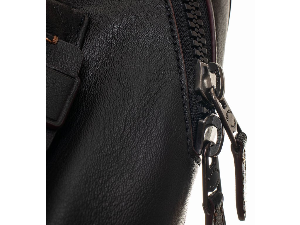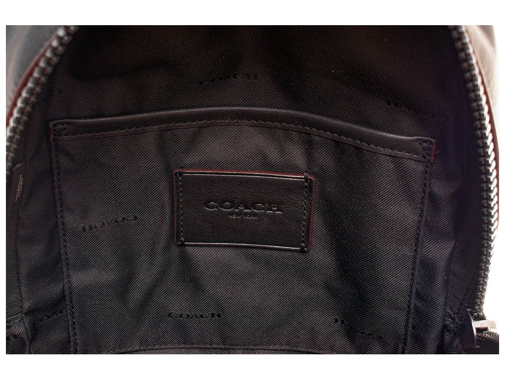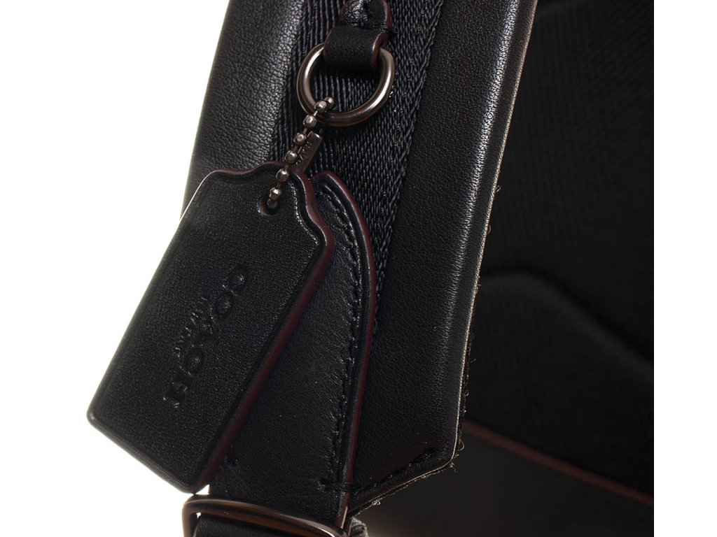 Pánský nebo unisex kožený batoh značky Coach New York v černé barvě s hnědým prošíváním. Z vnější strany jedna kapsa na zip, uvnitř dvě volné kapsy. Vypolstrovaná záda i ramenní nastavitelný popruh, který lze libovolně připnout na kteroukoliv stranu pomocí karabiny. Veškeré kovové detaily v černé barvě a vyrytým názvem značky.
