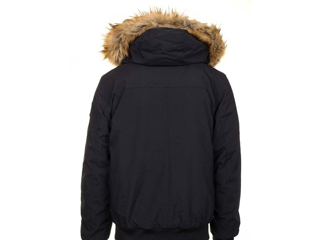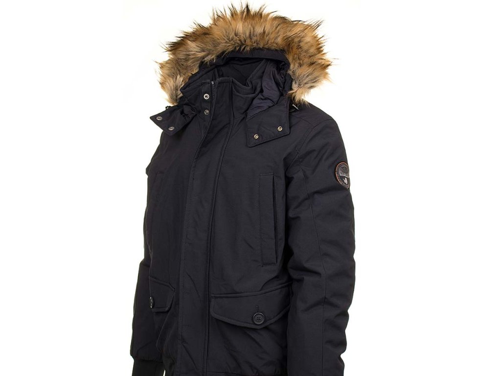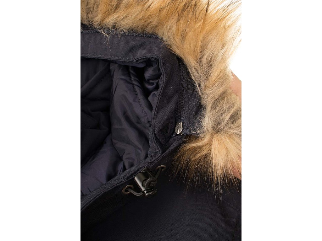 Napapijri zimní bunda v modré barvě. Kapuce má odepínací kožíšek. Volný střih, vpředu čtyři kapsy,ve spodní části dvě kapsy s klopou se zapínáním na knoflík a dvě volné kapsy na hrudi,uvnitř jedna kapsa na zip. Na levém rukávu nášivka Napapijri, vzadu ve spodní části malá trikolora typická pro Napapijri.