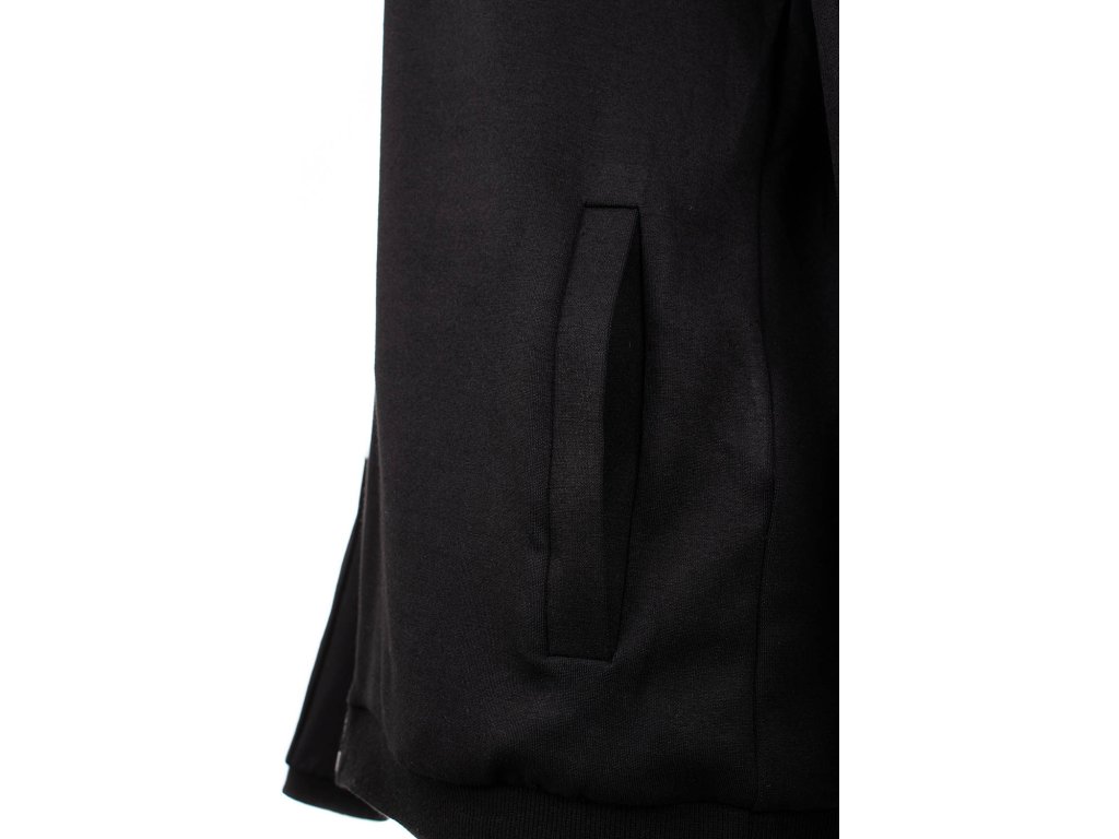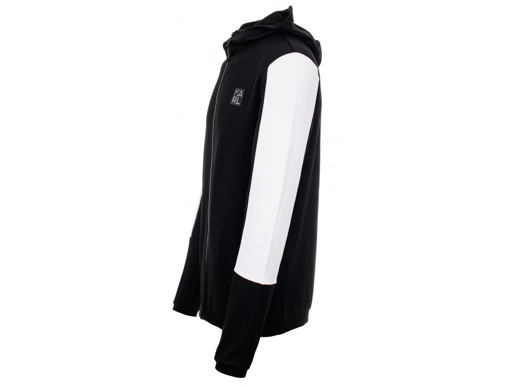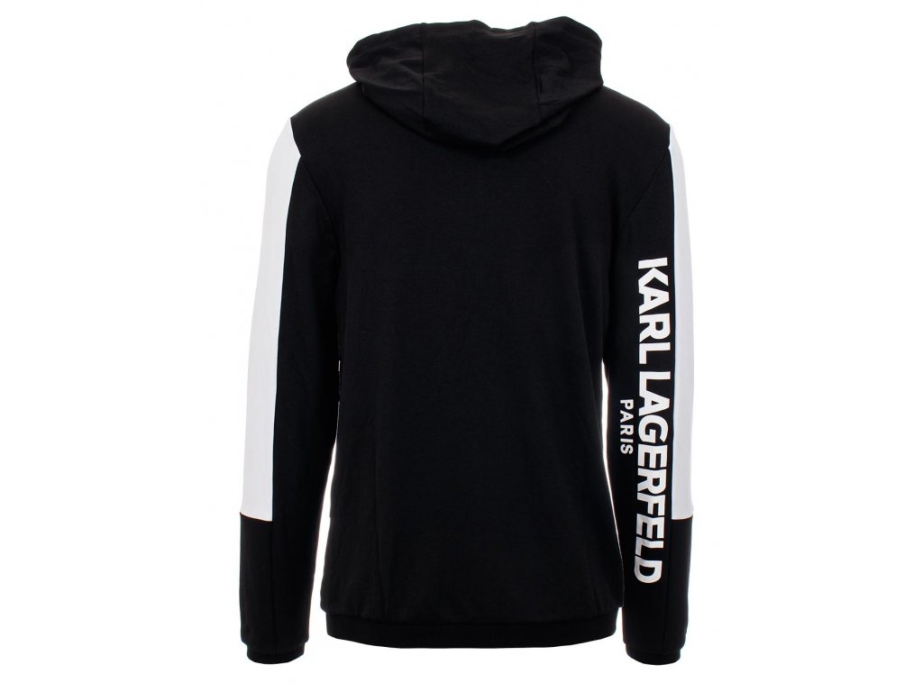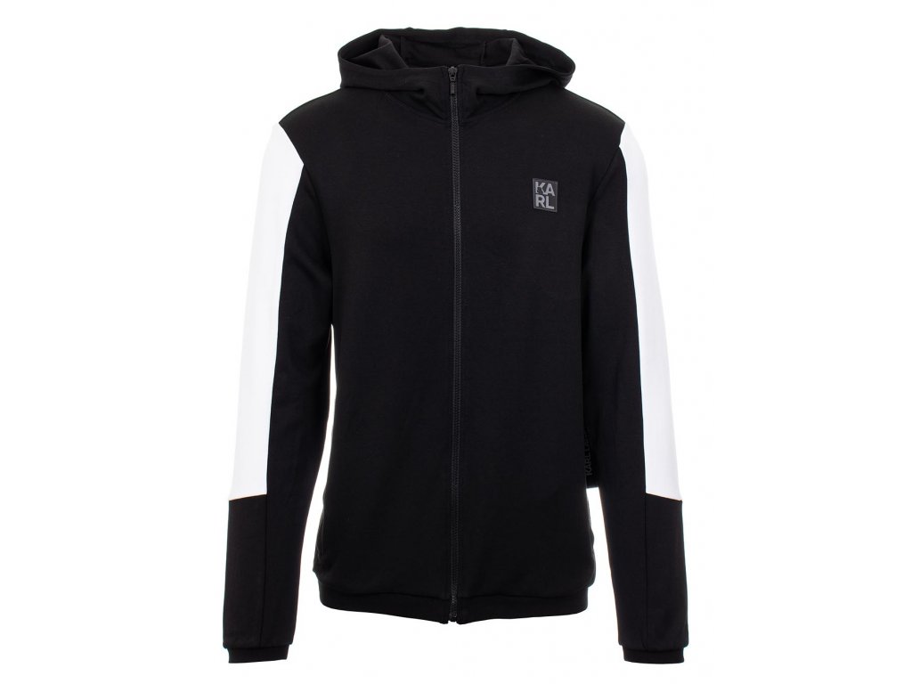 Pánská sportovní běžecká mikina značky Karl Lagerfeld v černé barvě, s býlími pruhy na rukávech a potisky loga "KARL LAGERFELD PARIS". Mikina je s kapucí, hlavní zapínání na zip, dvě volné kapsy a na hrudníku se nachází silikonové logo "KARL". Na rukávech a v pase pružné žebrované lemy.