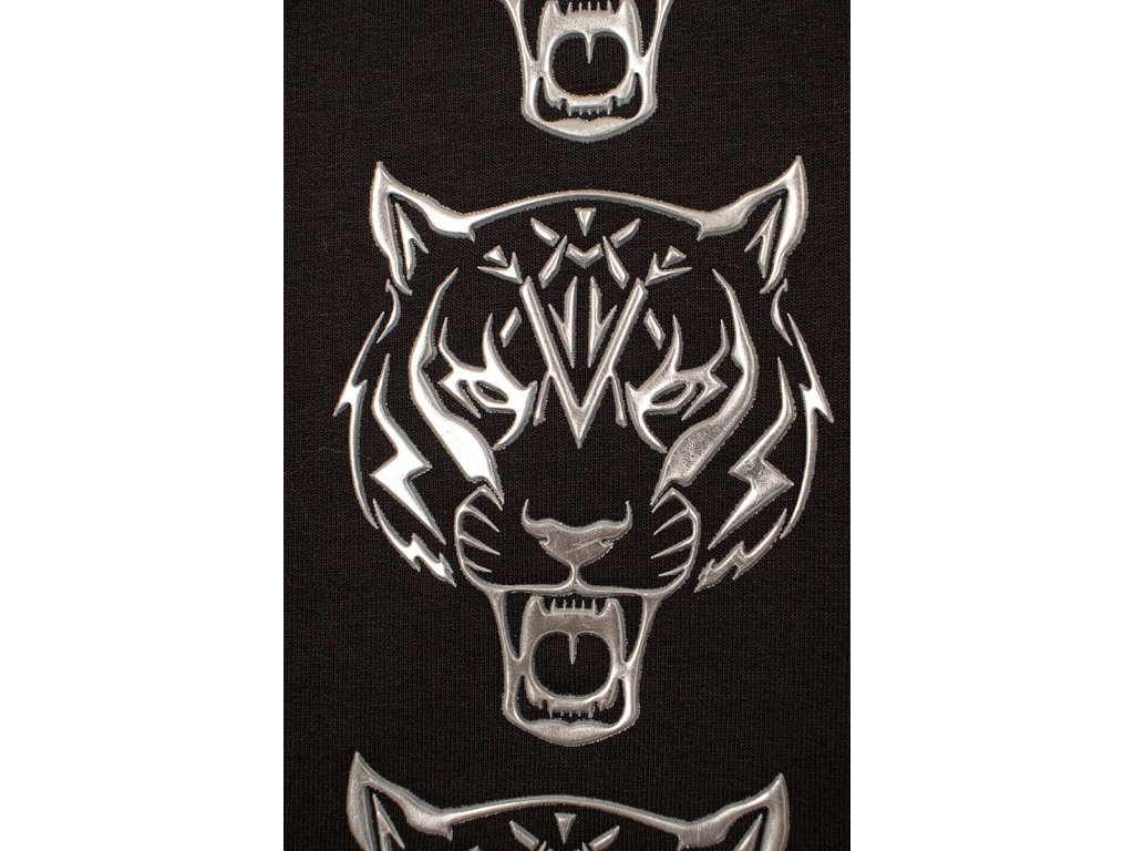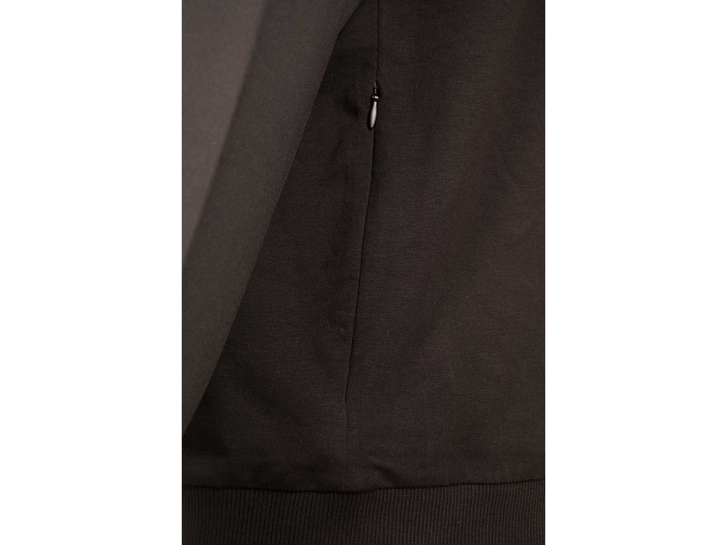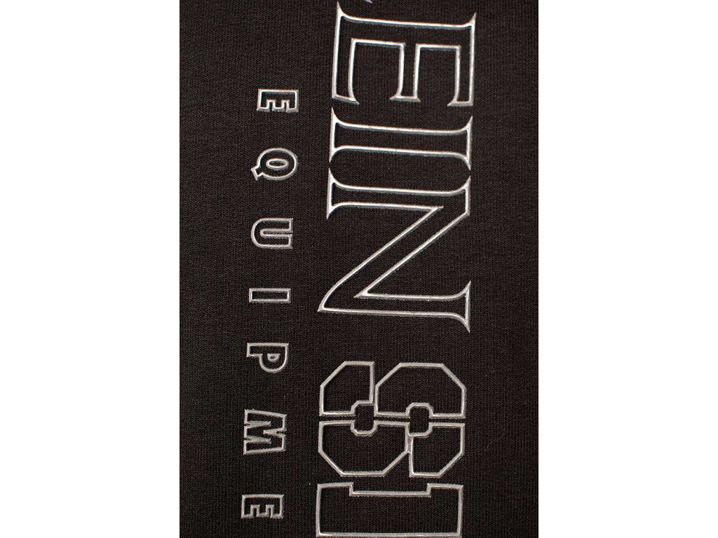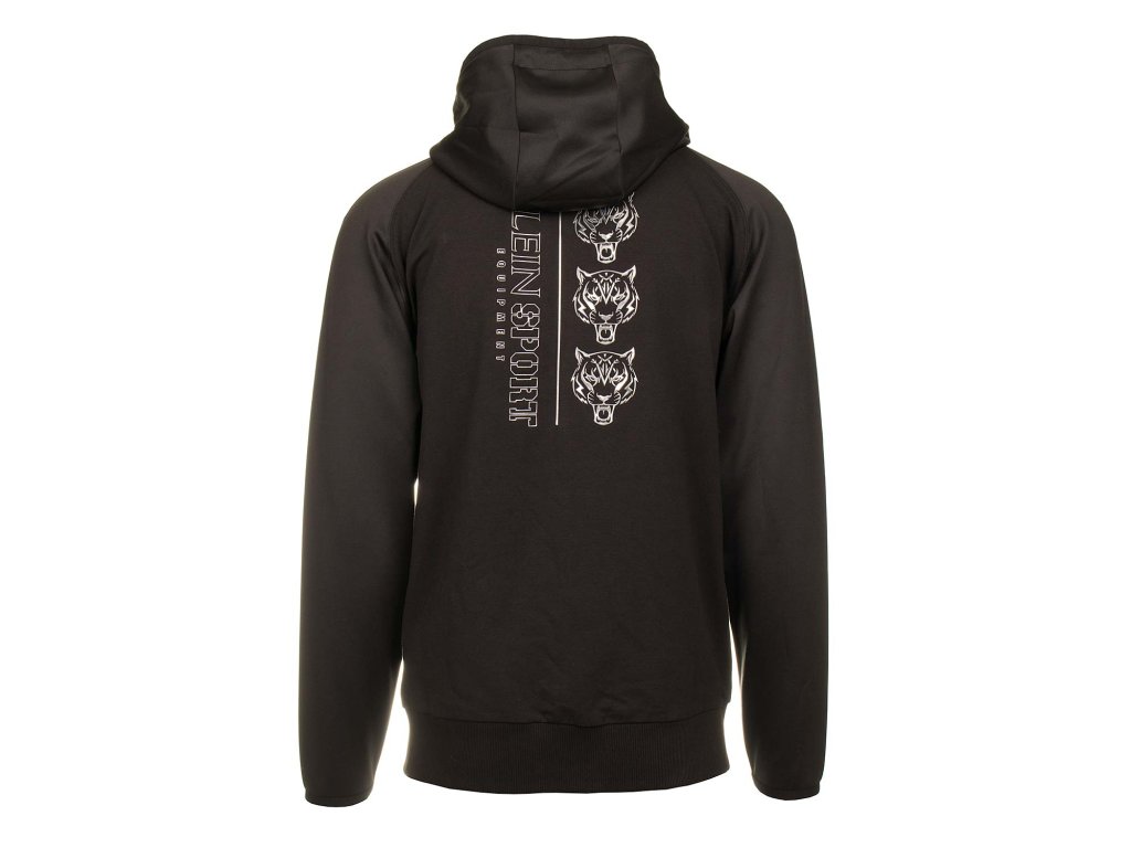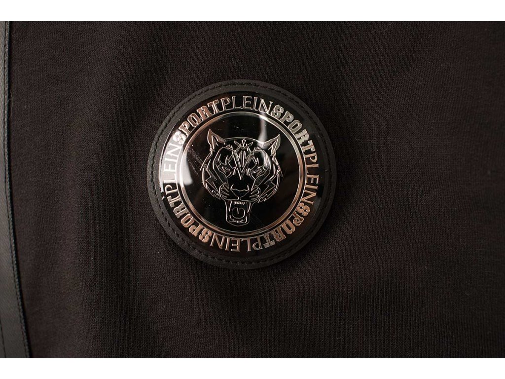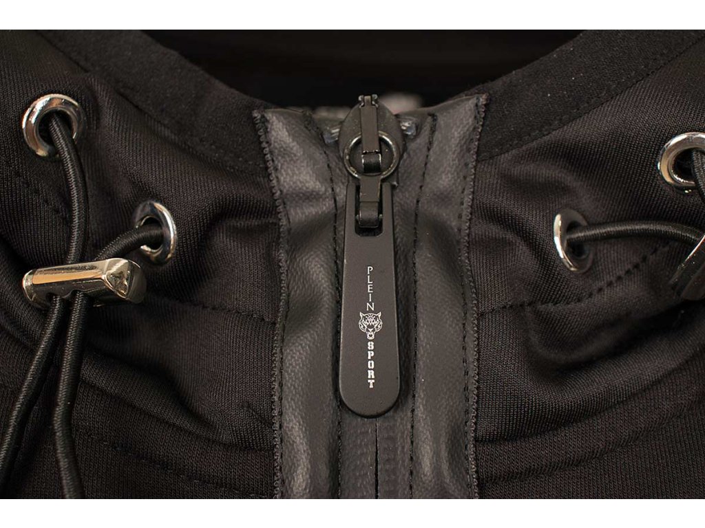 Pánská mikina od luxusní značky Plein Sport. Černá rozepínací mikina s kapucí. Logo na hrudi, na zádech stříbrné plastické logo Plein Sport. Po stranách kapsy na zip. Spodní část zakončuje pružný lem. Mikina je zpracovaná specifickým stylem, tím že tělo mikiny a rukávy jsou vyrobené z odlišného materiálu. Konkrétně tělo z bavlny a rukávy z polyesteru.