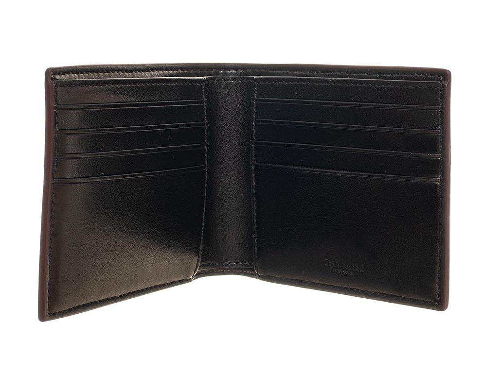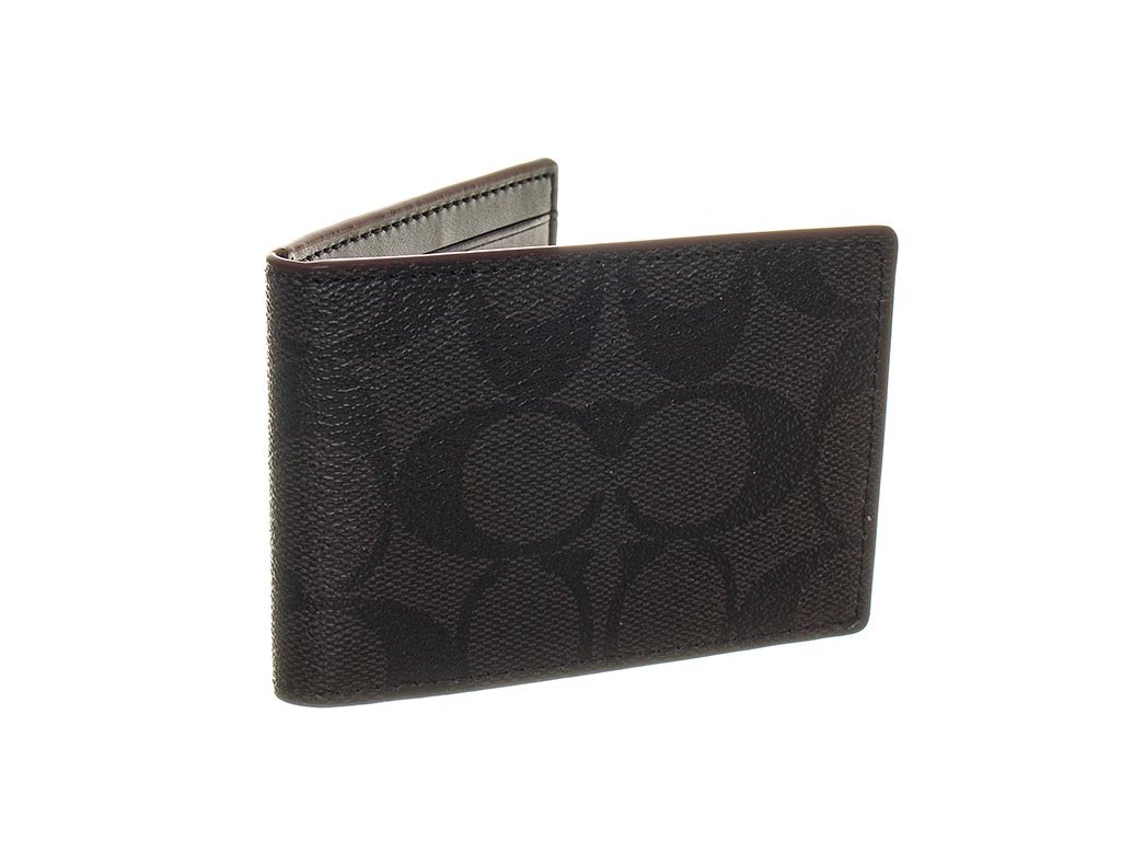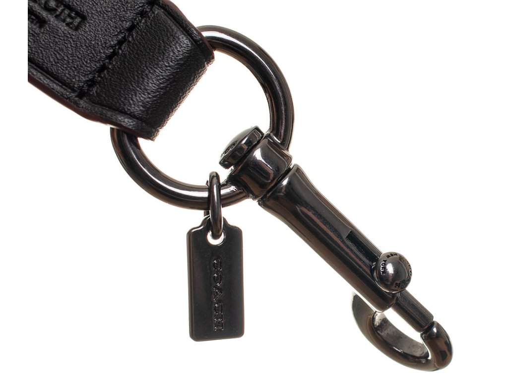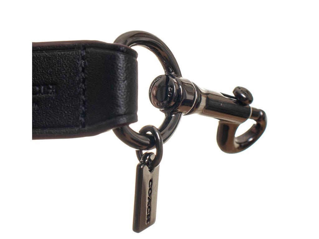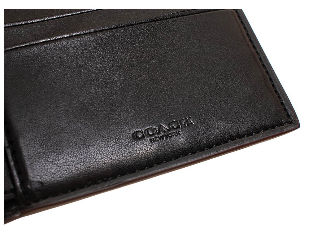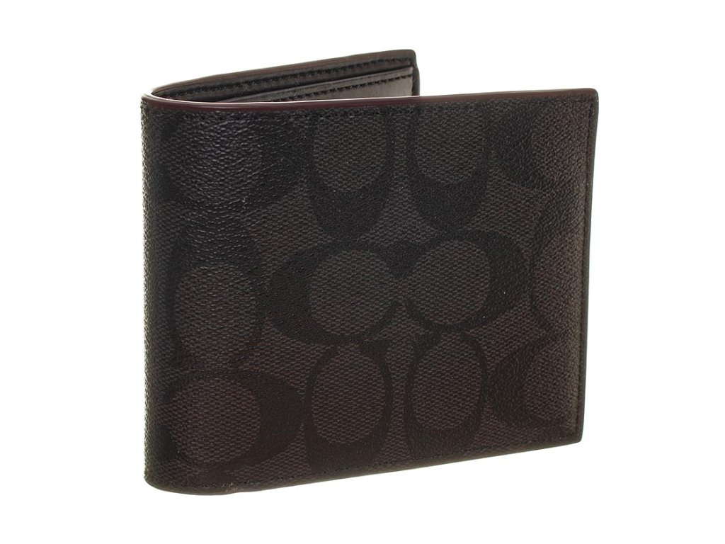 Pánský troj set značky Coach New York. Set obsahuje peněženku a vizitkovník v šedo černé barvě s monogramy a klíčenku v černé barvě, na nichž jsou vytlačeny loga značky. Všechny tři produkty mají olemované kraje ve vínové barvě. Veškeré kovové detaily jsou v tmavém stříbrném kovu s vyrytými názvy značky.