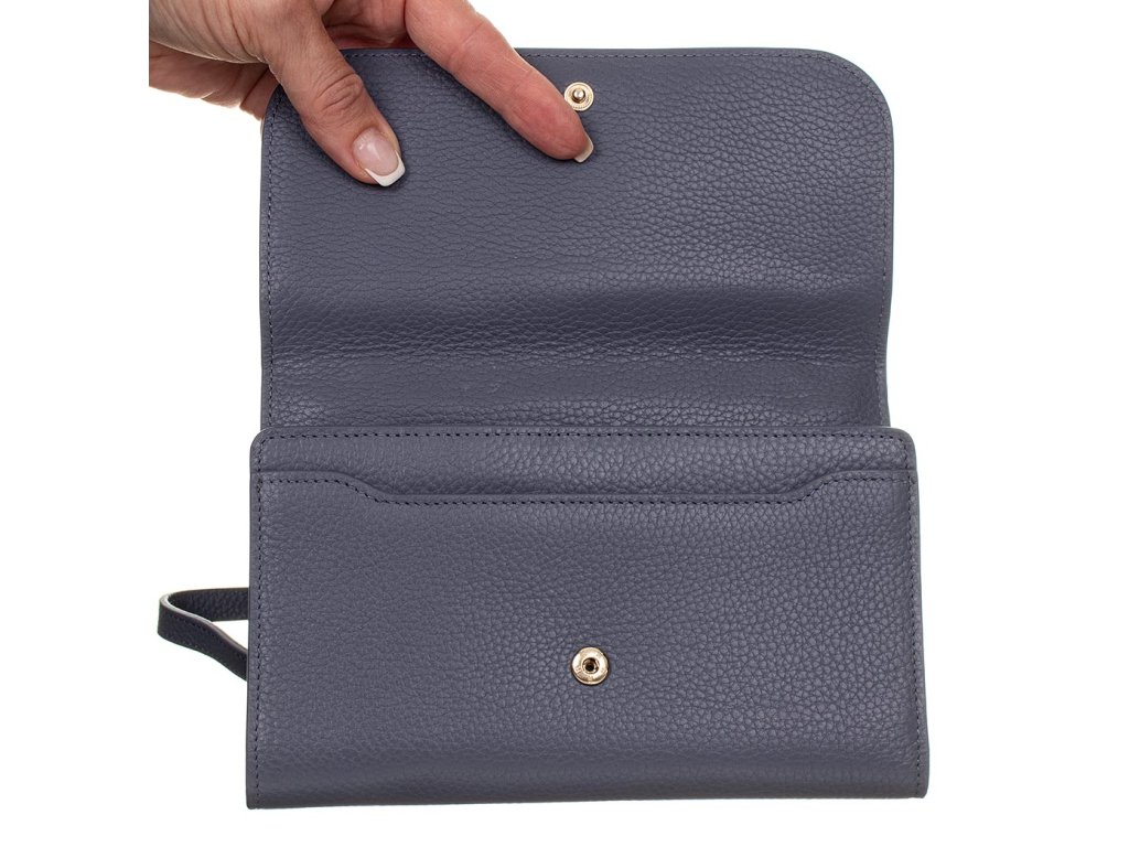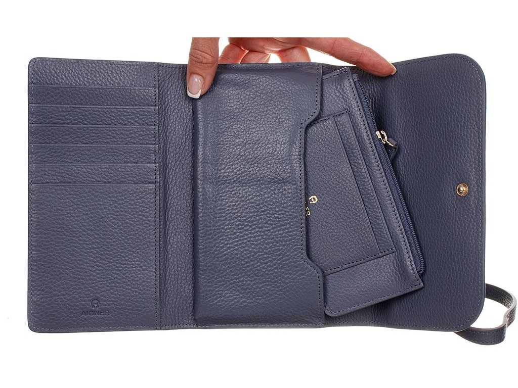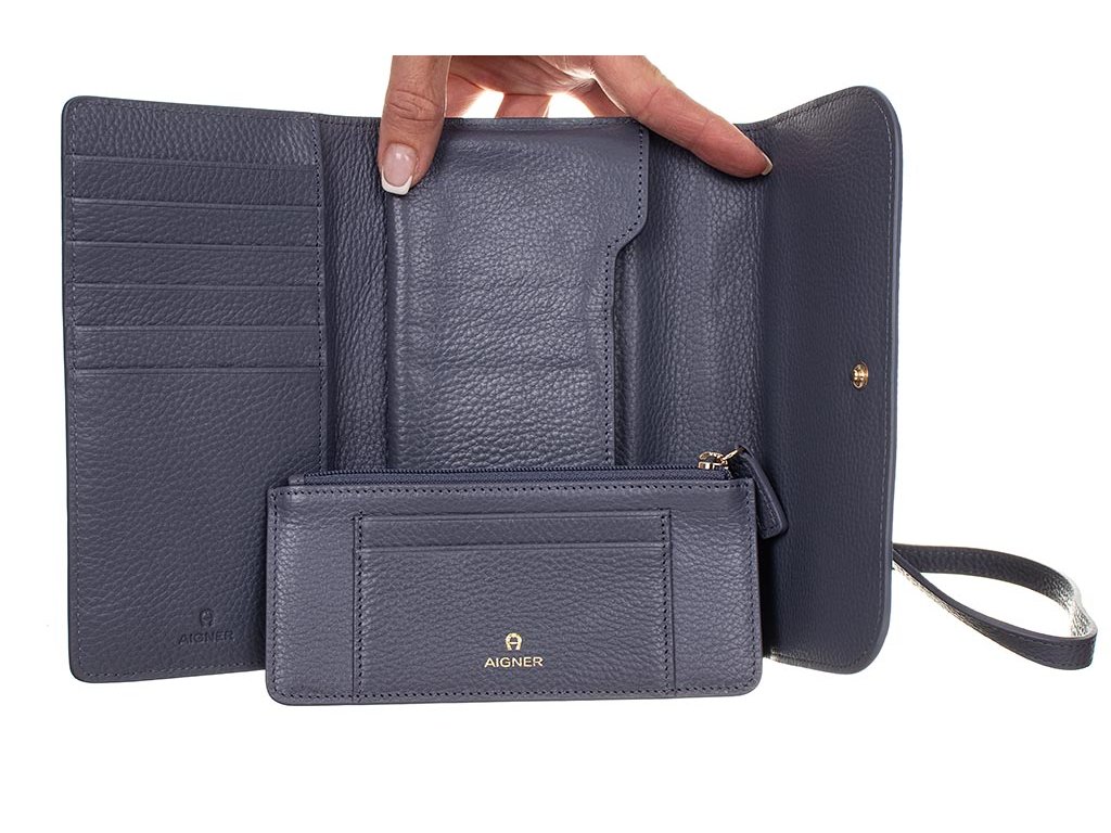 Dámské kožené psaníčko Aigner. Lze nosit jako psaníčko nebo peněženku díky odepínacímu popruhu. Kabelka má přihrádku na telefon, uvnitř vyjímatelná kapsa na zip například na mince, volné kapsy a přihádky na karty. Se zlatými kovovými detaily.